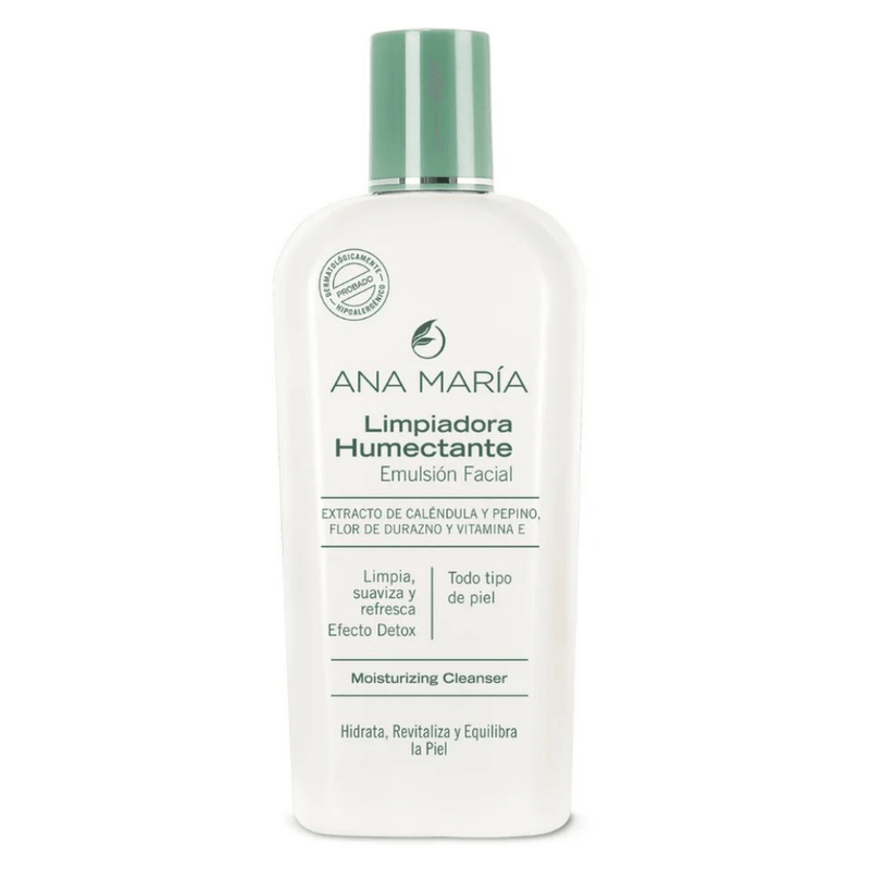 Te presentamos la maravillosa crema limpiadora humectante de Ana María, te ofrece retirar totalmente todo tipo de impurezas con un fantástico plus de propiedades descongestionantes, refrescantes y suavizantes, con un efecto Détox que te revitaliza la piel dejando una barrera de protección con un alto nivel de hidratación. Funciona para todo tipo de piel. Contiene extractos de caléndula, pepino, flor de durazno y vitamina E que al combinarse hacen de esta emulsión un producto altamente refrescante y suavizante. Producto libre de crueldad animal.Atrévete a probarlo y tu rostro siempre resaltará. ¿Cómo aplicar la crema Limpiadora Humectante de Ana María? Aplícala en la mañana y en la noche sobre cara y cuello con un ligero masaje circular y luego retira con un pañuelo facial o enjuaga con agua.