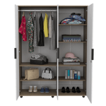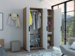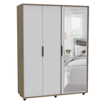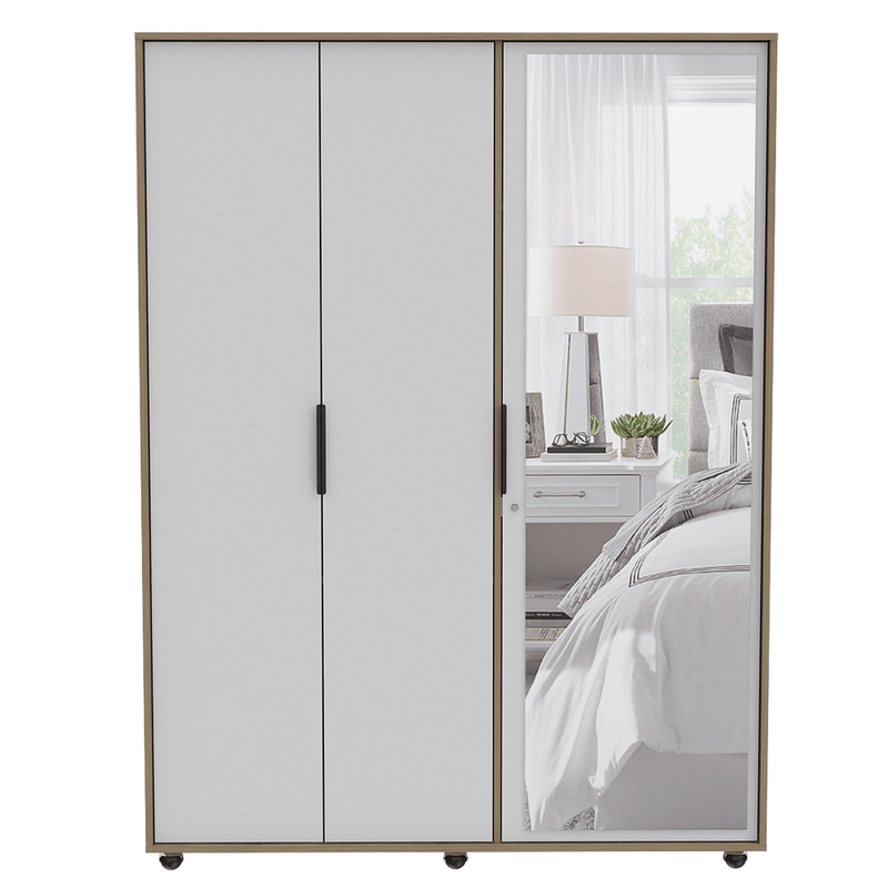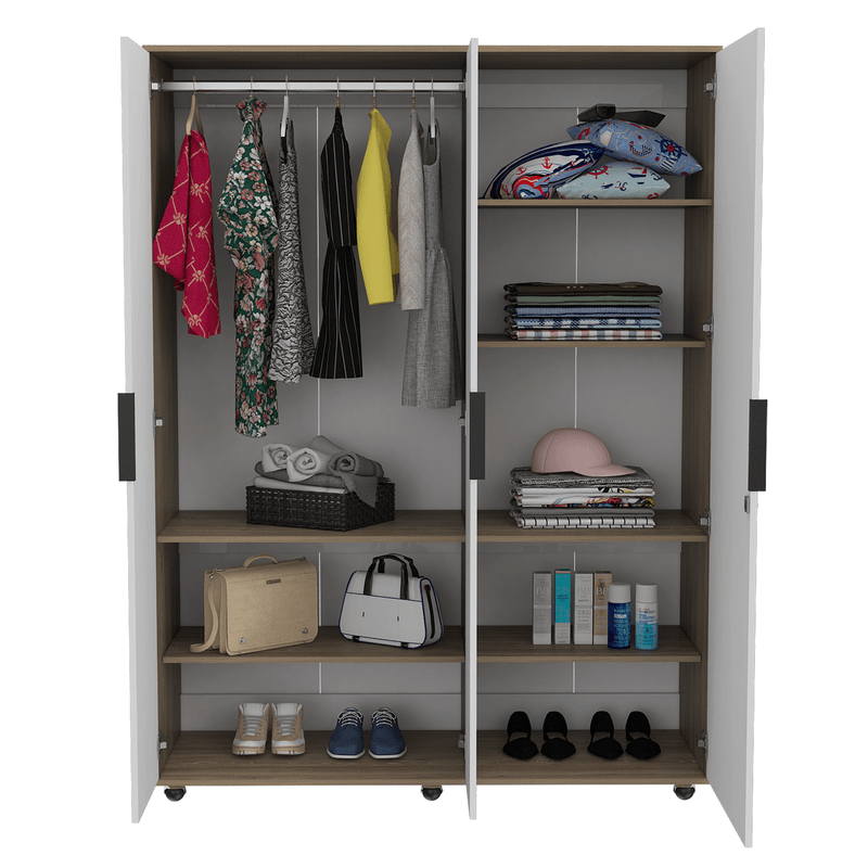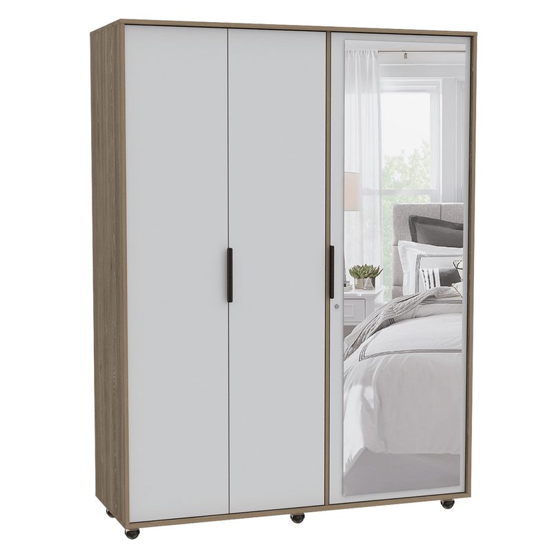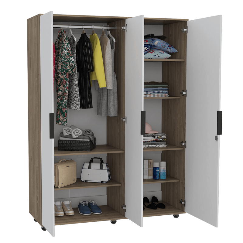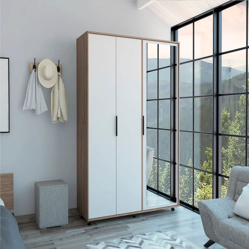 Diseño moderno con combinación de colores, tres puertas con manija de aluminio y un tubo para colgar ropa, seis entrepaños para ubicar objetos. Hecho de madera aglomerada, limpiar en seco, no productos abrasivos, ni humedad alta , La foto de este producto ha sido ambientada, por lo cual no incluye ningún adorno, ni accesorios, ni piezas adicionales ni ningún otro elemento que lo acompañan. El color presentado en la fotografía es una aproximación al color real. Medidas en centímetros: Alto: 188,3 Ancho: 140 Profundo: 52,3 Peso: 102,7 Kg NO INCLUYE ARMADO, Hecho de madera aglomerada, limpiar en seco, no productos abrasivos, ni humedad alta , La foto de este producto ha sido ambientada, por lo cual no incluye ningún adorno, ni accesorios, ni piezas adicionales ni ningún otro elemento que lo acompañan. El color presentado en la fotografía es una aproximación al color real.