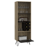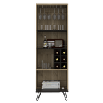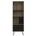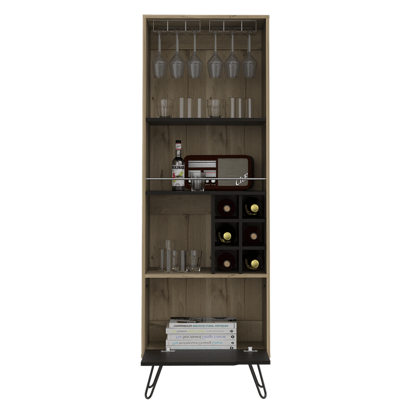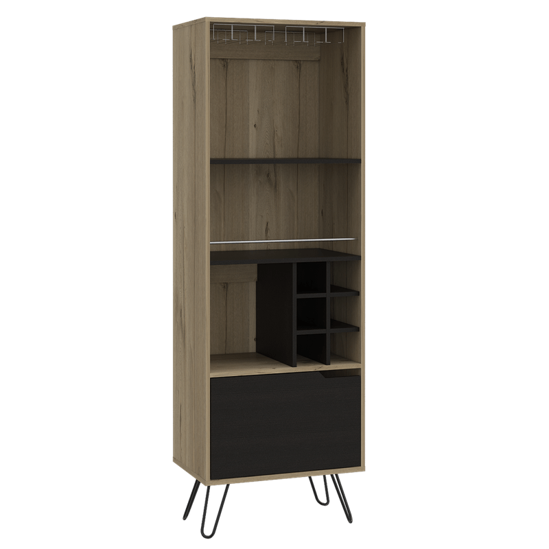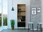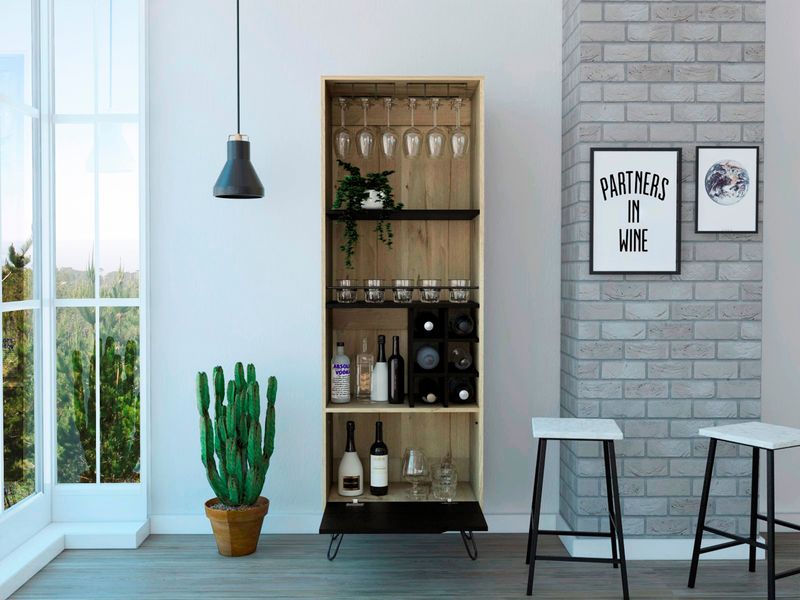 Bar alto con espacio superior para almacenar copas de vino, espacio para colocar objetos decorativos, espacios para organizar licoses, patas metalicas en acero negro con medidas de: ANCHO 59,7 ALTO 180 PROFUNDO 39,6