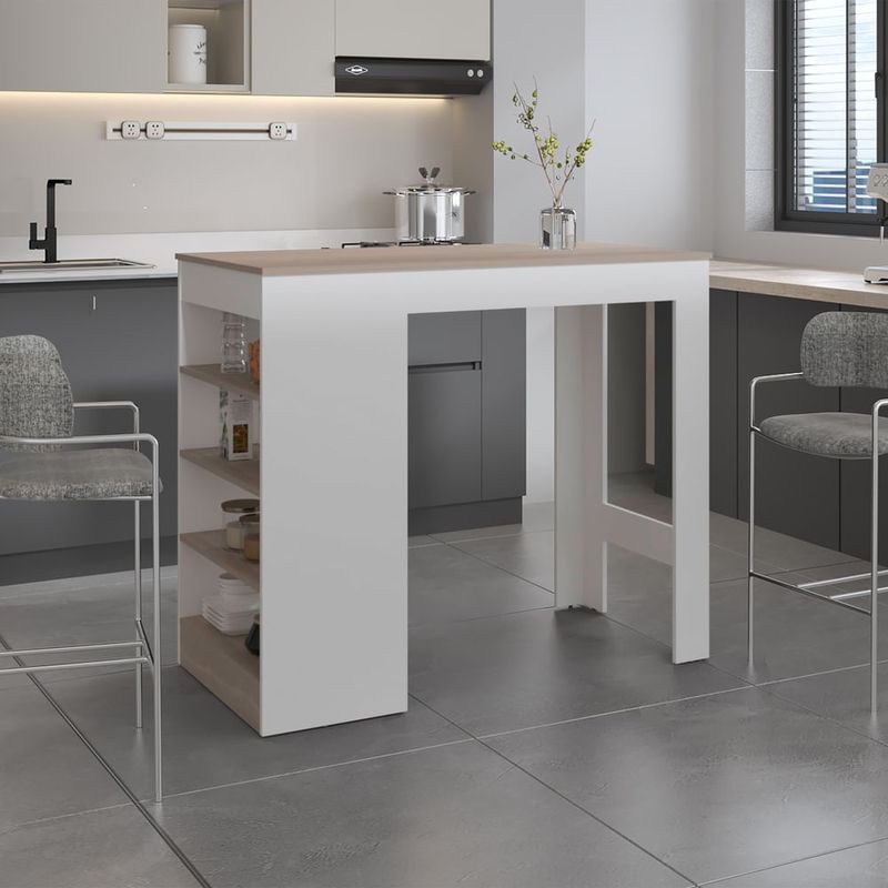Barra auxiliar de cocina moderna, con comnbinación de colores, tres entrepaños, con espacio para ubicar objetos de cocina, y es de facil instalación