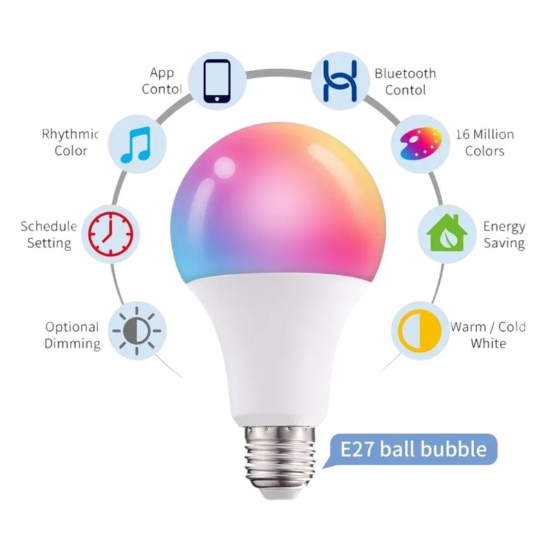 Convierte cualquier espacio en un ambiente moderno, colorido e inteligente con este bombillo. Controla su encendido, color y brillo desde tu celular a través de conexión Bluetooth, sin necesidad de dispositivos adicionales. Elige entre una gran variedad de colores, ajusta el tono cálido o frío, crea efectos rítmicos con música, o programa horarios automáticos. Ideal para hogares, oficinas o espacios creativos que buscan funcionalidad y estilo con ahorro energético.