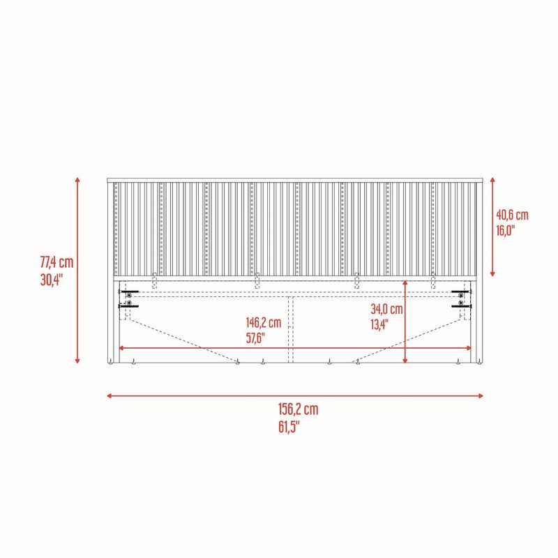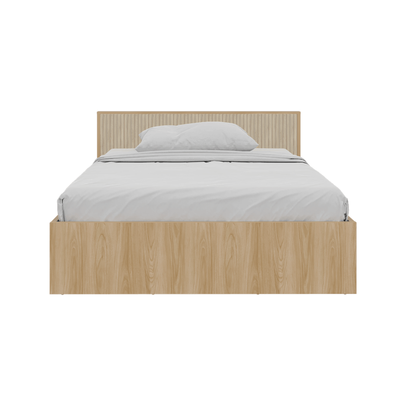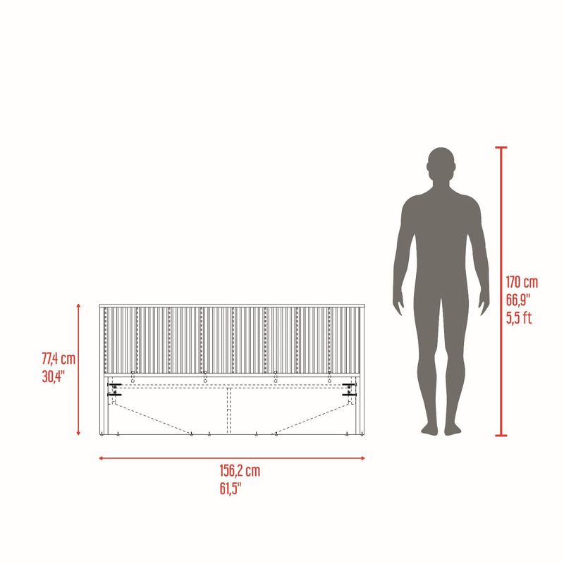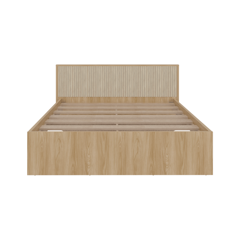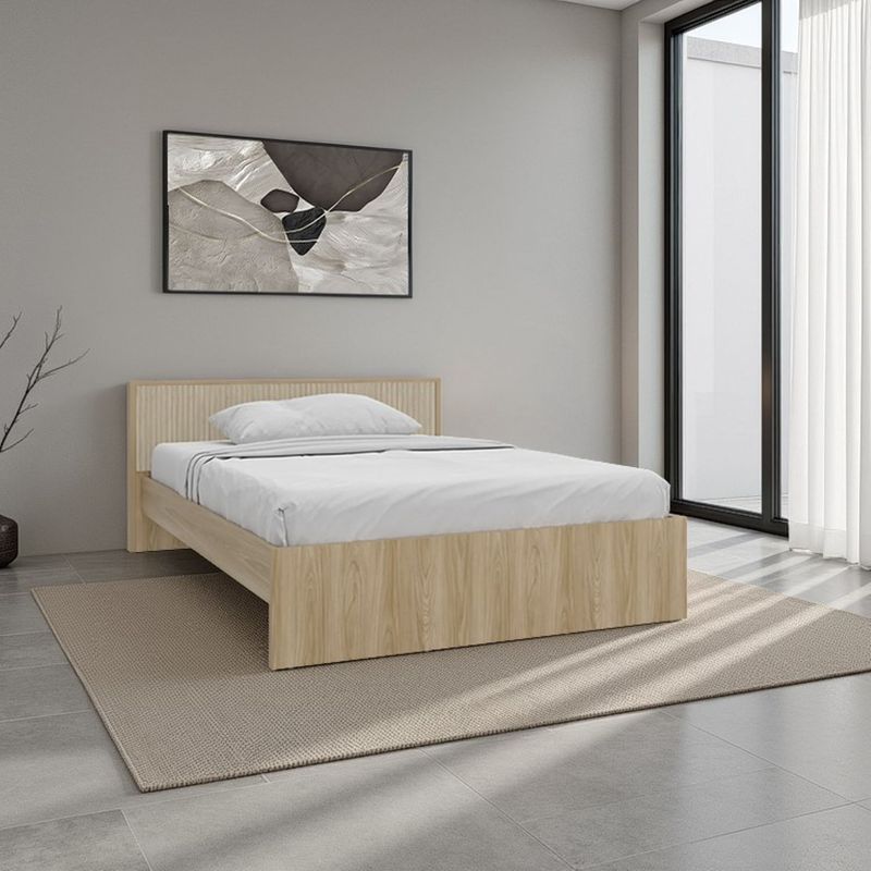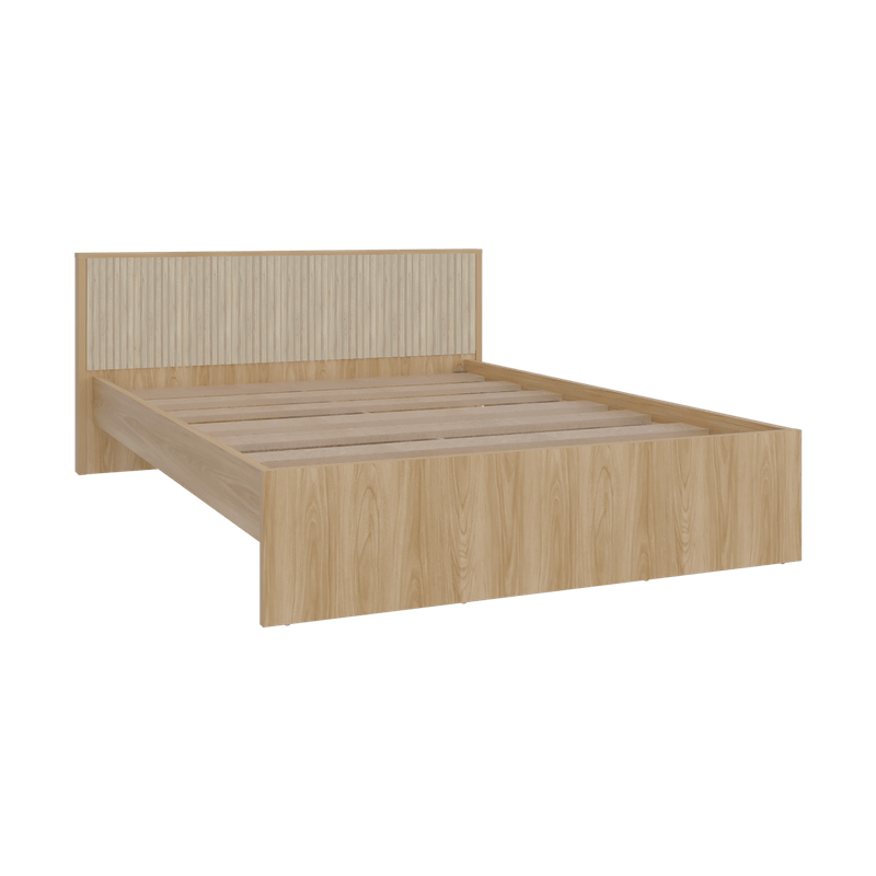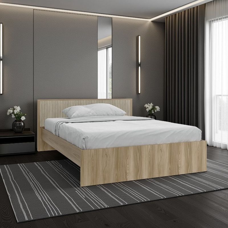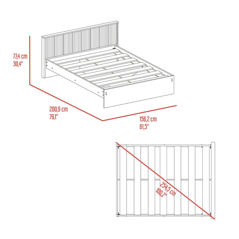 Cama doble moderna, para colchon de 140 x 190, incluye tendido de tablones, detalles decorativos en la cabecera, y es de facil instalación con medidas de: ALTO 77,4 ANCHO 156,2 FONDO 200,9