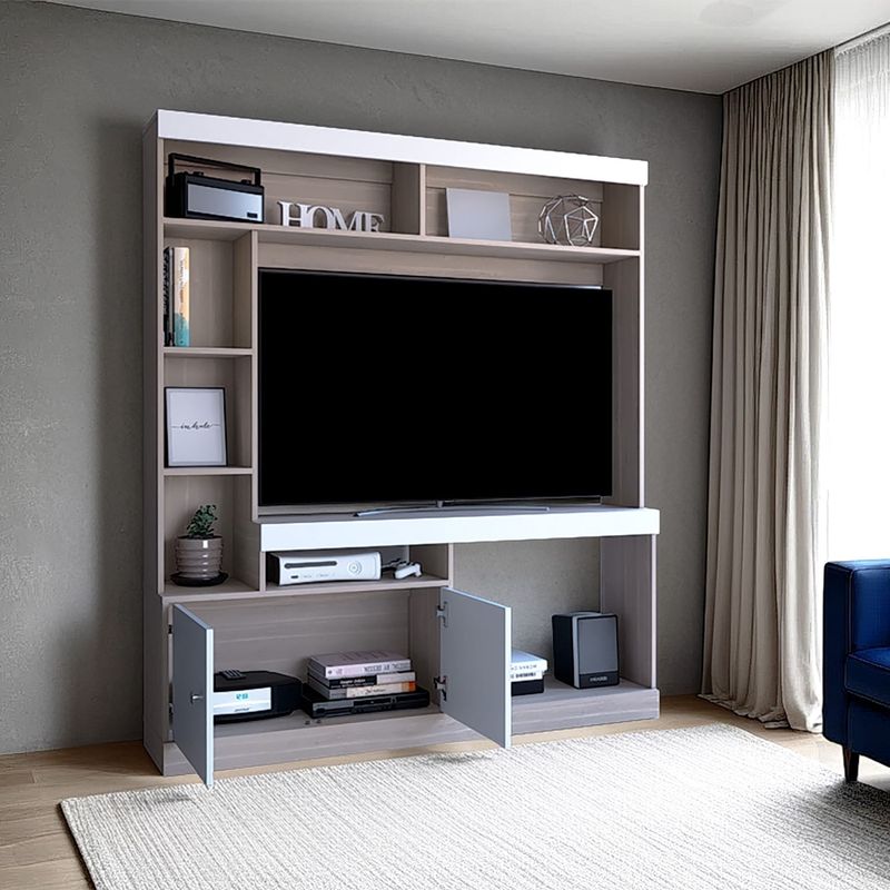 Centro de entretenimiento para TV de 55'' maximo, compartimientos para objetos decorativos, dos puerts abatibles con medidas de: ALTO 180,6 ANCHO 180 FONDO 30,6