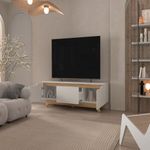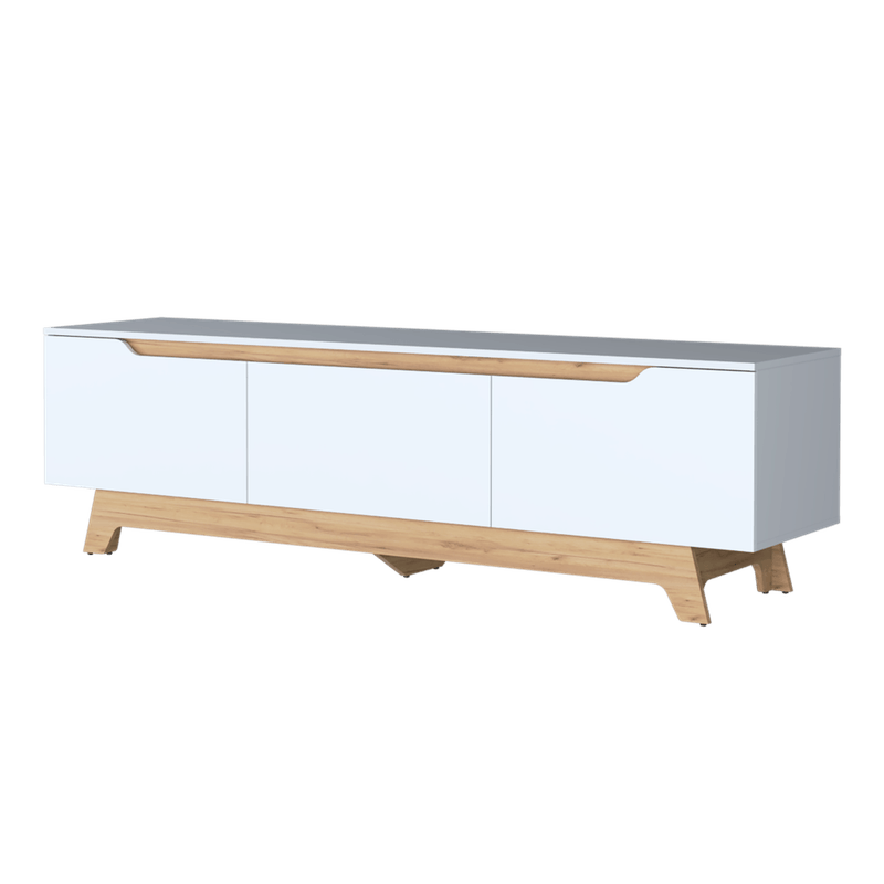 Centro de entretenimiento con espacio para TV de 80'', dos puertas abatibles y un cajon, pactricos espacios de almacenamiento con medidas de: ALTO 53 ANCHO 180,6 FONDO 45,1