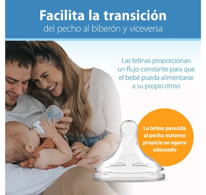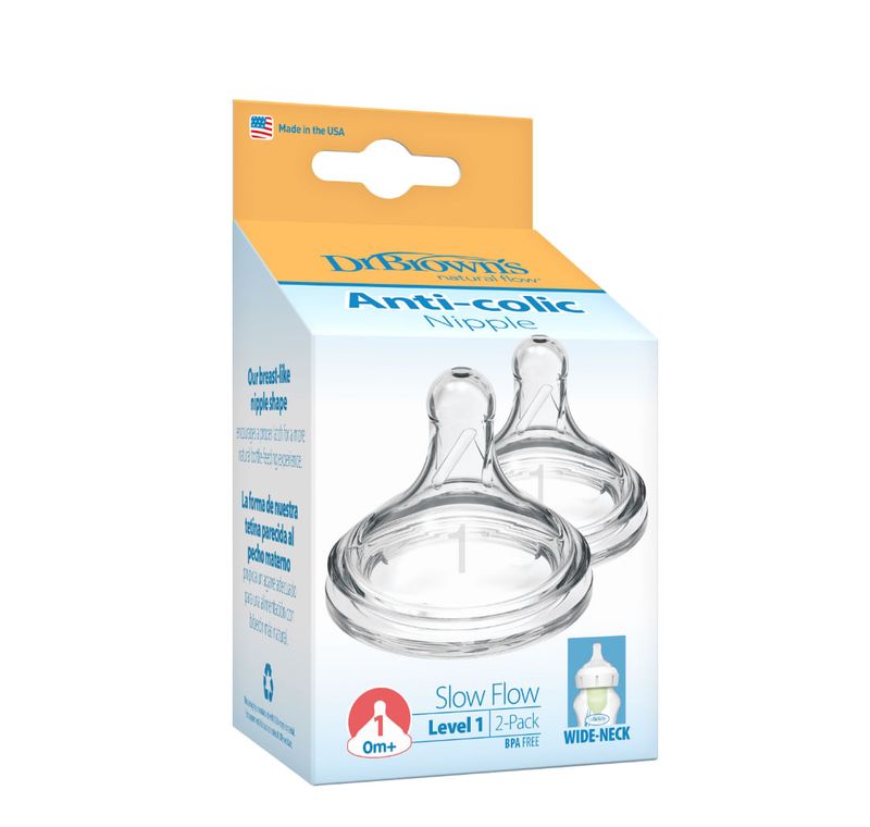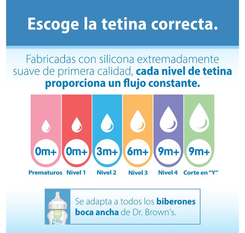 El chupo Dr. Brown's Natural Flow® Nivel 1 tiene el tamaño perfecto para recién nacidos y ofrece un flujo lento. Está clínicamente probado que la tetina Dr. Brown's® Nivel 1, junto con el sistema de ventilación interna Anti-Colic, reduce los cólicos. El biberón y la tetina Dr. Brown's® brindan una experiencia de alimentación más cómoda para el bebé al disminuir las regurgitaciones, los eructos y los gases. Esta alimentación sin vacío es la más cercana a la lactancia materna y las tetinas de flujo lento de Dr. Brown's® brindan un flujo constante para que el bebé pueda alimentarse a su propio ritmo. La forma del pezón similar al pecho fomenta un agarre adecuado para una experiencia de alimentación con biberón más natural y facilita la transición del pecho al biberón y viceversa. Se ha demostrado que el sistema de ventilación anticólico y tetina de nivel 1 ayuda a conservar los nutrientes de la leche del biberón y ayuda en la digestión para dormir mejor por la noche. Fabricada 100 % de silicona súper suave, la tetina de nivel 1 se adapta a todos los biberones de cuello ancho Options+™ de Dr. Brown's®. El rango de edad sugerido para la tetina de nivel 1 es 0 meses o más, pero el caudal preferido del bebé puede variar. Seguro para usar en lavavajillas (solo en la rejilla superior), esterilizadores eléctricos y de microondas o en agua hirviendo. Sin BPA.