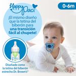 Calmar a tu bebé es más fácil con el HappyPaci de Dr. Brown´s. Este suave chupete 100 % de silicona tiene la forma del chupo del tetero con la que el bebé ya está familiarizado, para que lo acepte fácilmente. La silicona es suave para las encías sensibles y delicadas, pero lo suficientemente resistente como para resistir las mordidas. El exclusivo escudo en forma de mariposa se curva hacia afuera de la cara del bebé dejando espacio para su nariz, barbilla y mejillas y sus orificios ayudan a reducir la irritación al permitir el flujo de aire a la piel del bebé. Su diseño de espalda abierta te permite colocar el dedo en la pera para conectar mejor con él y consolarlo. El diseño de una sola pieza hace que el HappyPaci sea fácil de limpiar, y la espalda abierta evita que el agua quede atrapada dentro de la pera. Apto para lavavajillas (rejilla superior) y esterilizador.