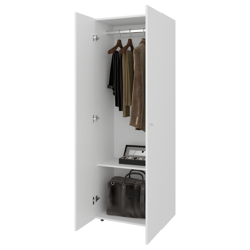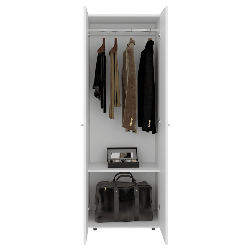 Closet moderno, con 2 puertas abatibles, 1 entrepaños, 1 Tubo para colgar, con espacio para almacenar ropa y objetos, 2 botones en aluminio y es de facil instalación con medidas de: ALTO 170 ANCHO 60 FONDO 40,2