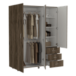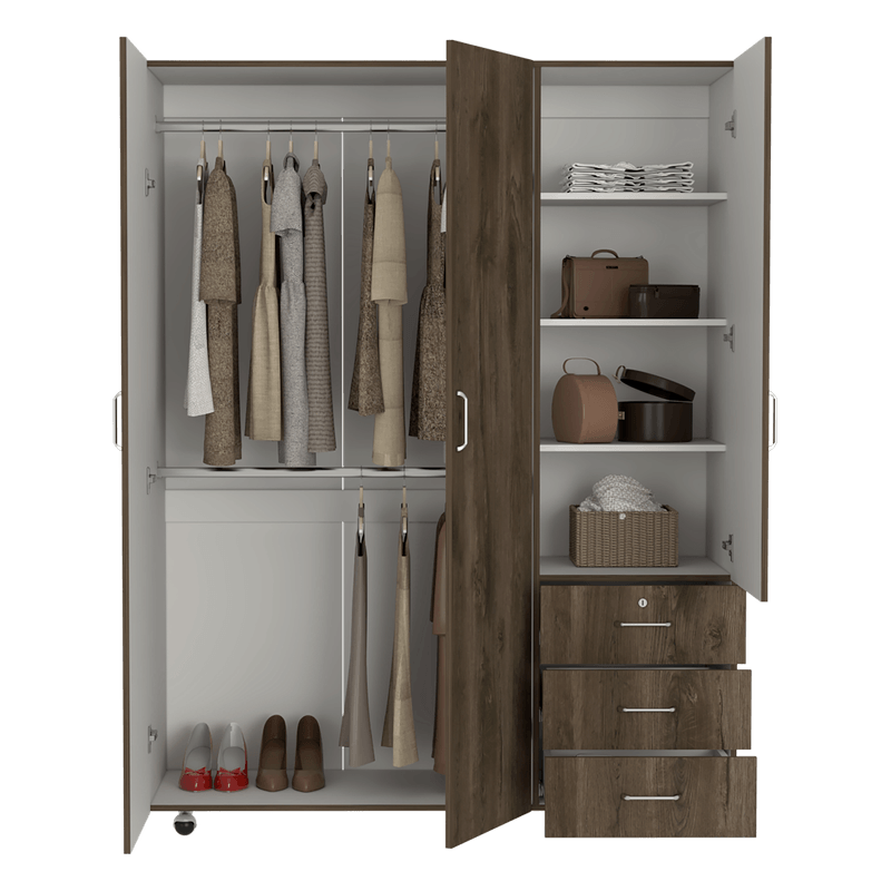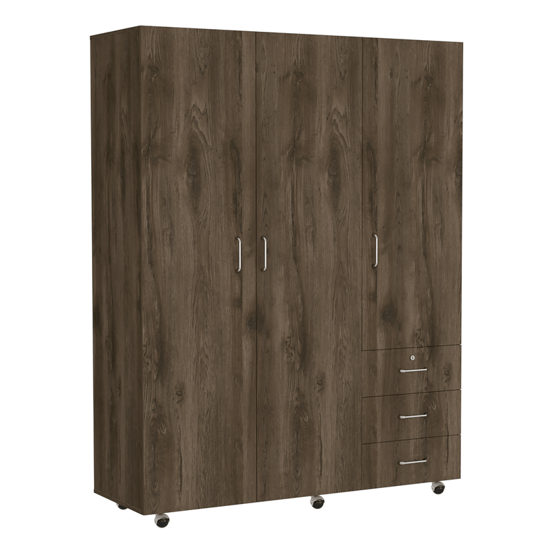 Closet con tres puertas abatibles, tres cajones uno con cerradura, dos tubos de acero cromado para colgar ropa, amplios espacios para guardar ropa con medidas de: ANCHO 140 ALTO 183 PROFUNDO 48