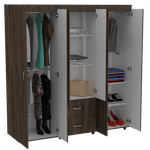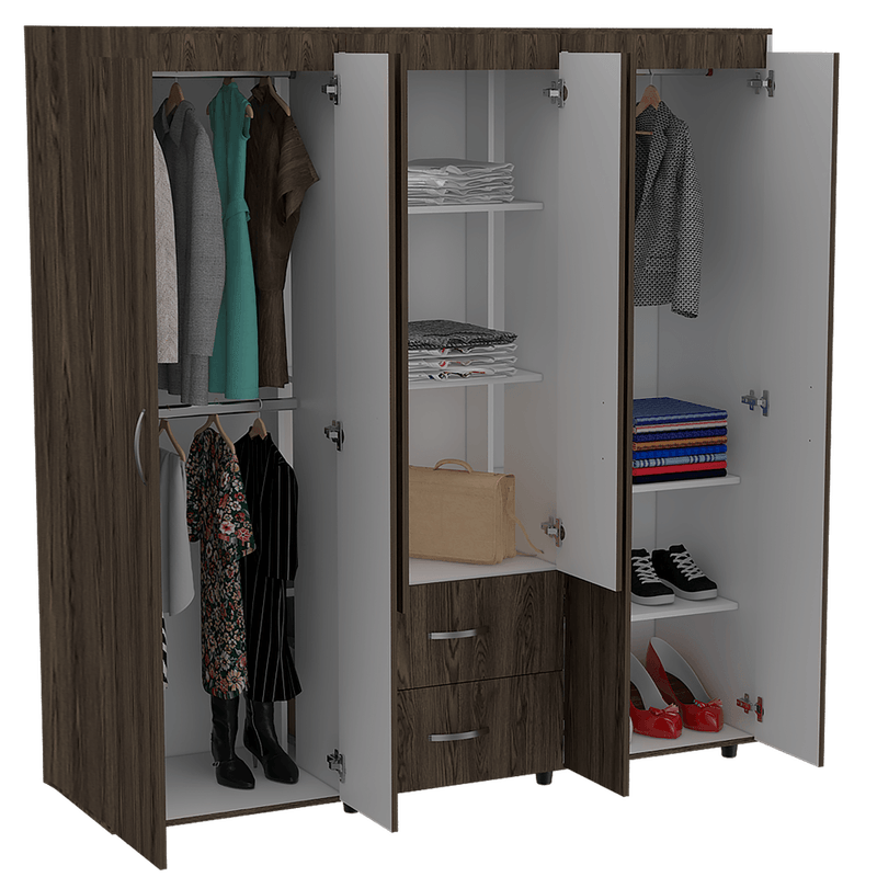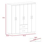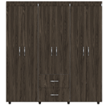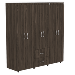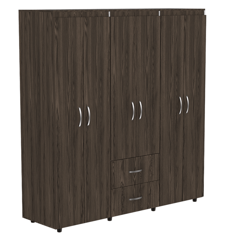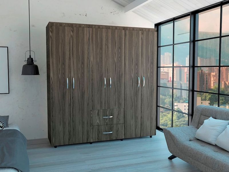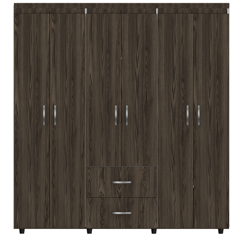 Closet con amplios espacios y entrepaños para organizar, seies pertas abatibles, tres tubos cromados para colgar ropa, dos cajones organizadores multiusos, manijas metalicas doradas, deslizadores plasticos para apoyo al piso con medidas de: ALTO 180 ANCHO 170,3 FONDO 50,3