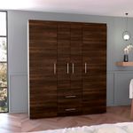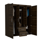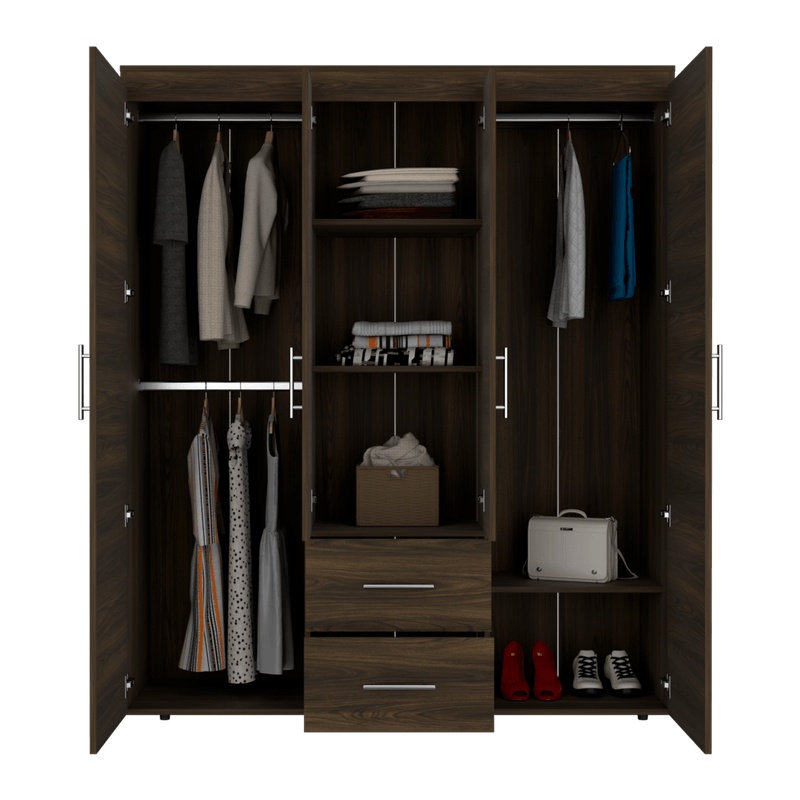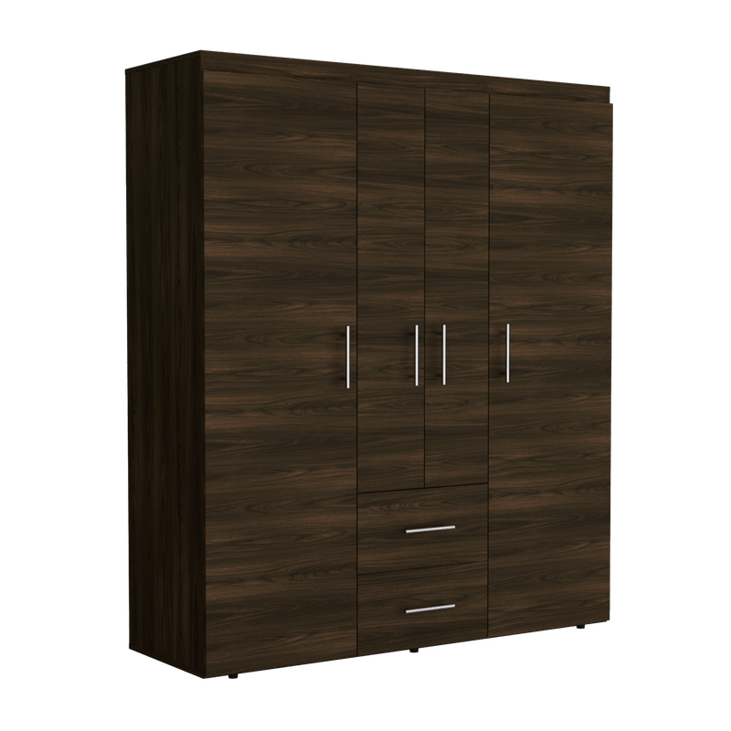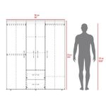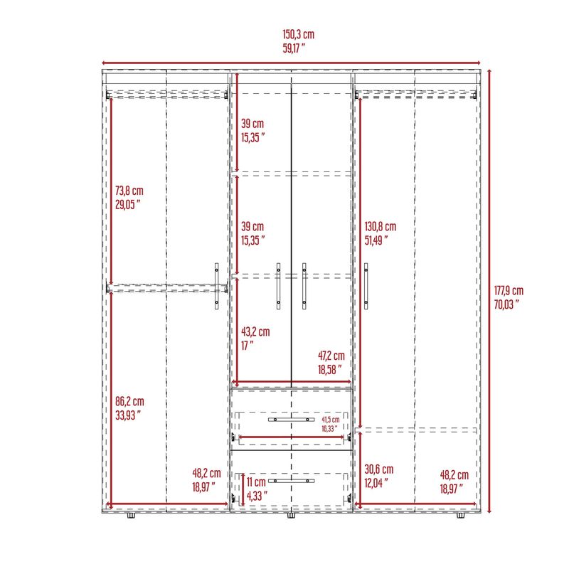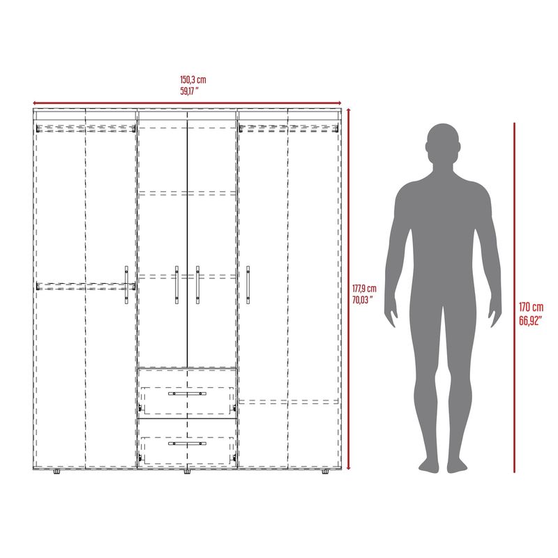 Closet con 4 puertas batientes, 2 cajones, 3 tubos para colgar ropa y con amblio espacio de almacenamiento. con medidas de: ALTO 177,9 ANCHO 150,3 FONDO 50,6