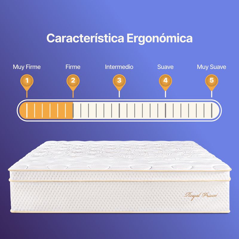 Colchón Royal Prince más 2 Almohadas – Soporte de Lujo, Higiene Garantizada Tu descanso merece firmeza, frescura y seguridad. El Colchón Royal Prince ha sido diseñado para ofrecer un soporte óptimo y estable, ideal para quienes buscan una sensación firme sin sacrificar el confort. Su combinación de resortes Pocket y múltiples capas de espumas de alta densidad brinda un descanso alineado, cómodo y duradero.