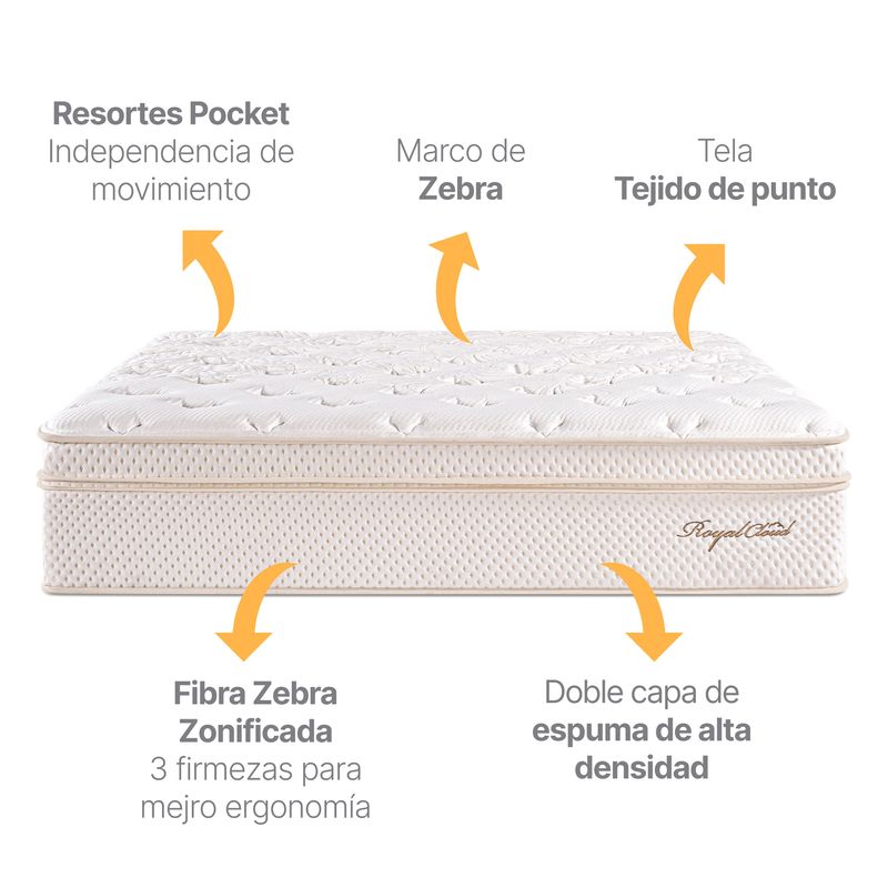 Colchón Royal Cloud 2 Almohadas – Máxima Comodidad con Higiene Total Descansa como en las nubes con el Colchón Royal Cloud, creado para ofrecerte una sensación única de suavidad, confort y naturalidad.