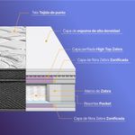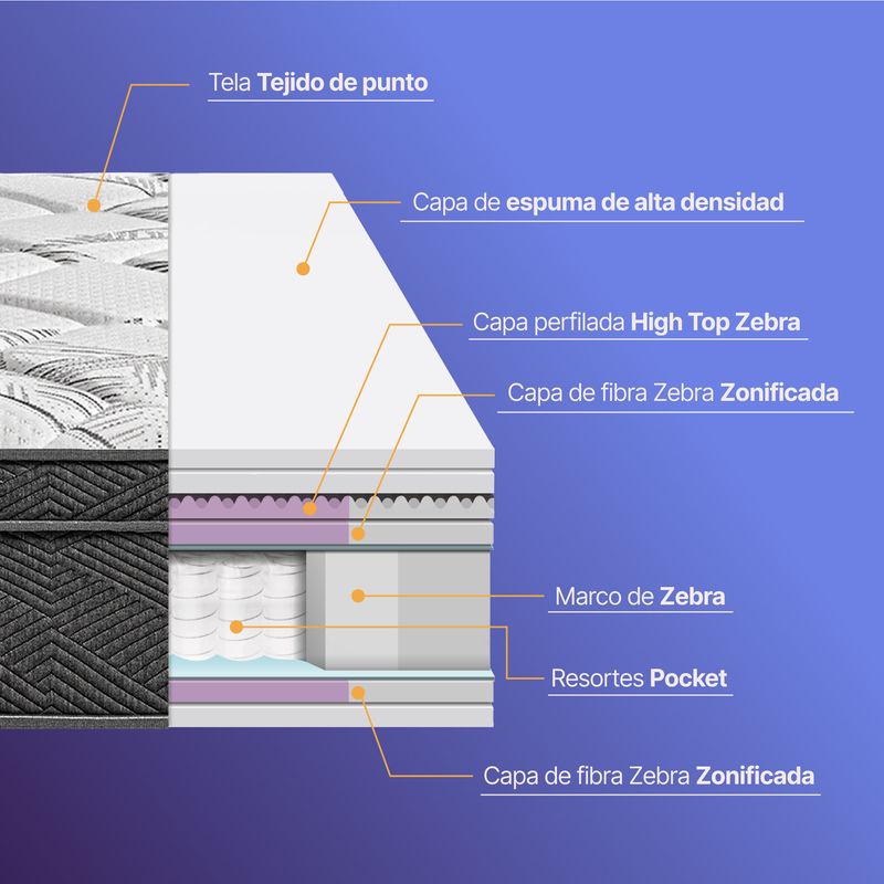 Ergosoft está creado para brindarte una experiencia de sueño envolvente, gracias a su sistema de soporte inteligente y máxima comodidad. Su tecnología Descanso³ Zebra Trizone, junto con el sistema de resortes Pocket, se adapta a la forma natural de tu cuerpo, ofreciendo un descanso equilibrado, sin interrupciones, y con una sensación intermedia ideal para cualquier tipo de durmiente.