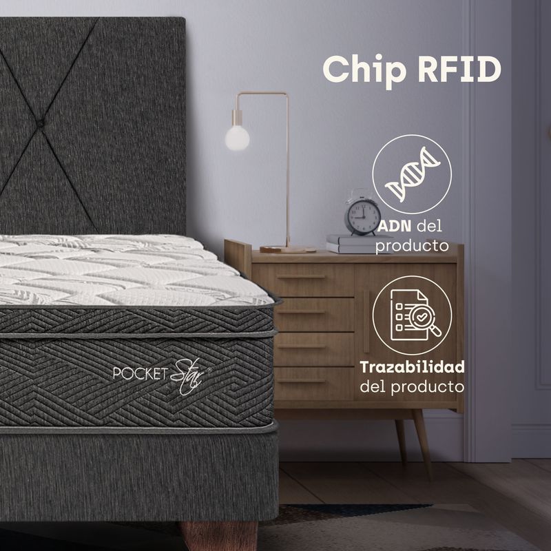 - Chip RFID: Gracias a la tecnología RFID, cada colchón cuenta con un dispositivo infalsificable que permite rastrear cada colchón en todas las etapas de su producción. Este chip asegura que el producto cumpla con el 100% de las pruebas de control de calidad, respaldando la garantía Essenza y nuestro compromiso total con tu satisfacción.