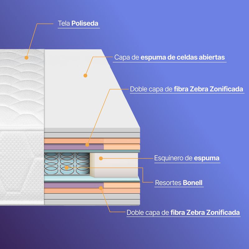 Equipado con fibra Zebra zonificada, se adapta a cada curva del cuerpo, mejorando la postura lumbar y brindando soporte inteligente donde más lo necesitas.