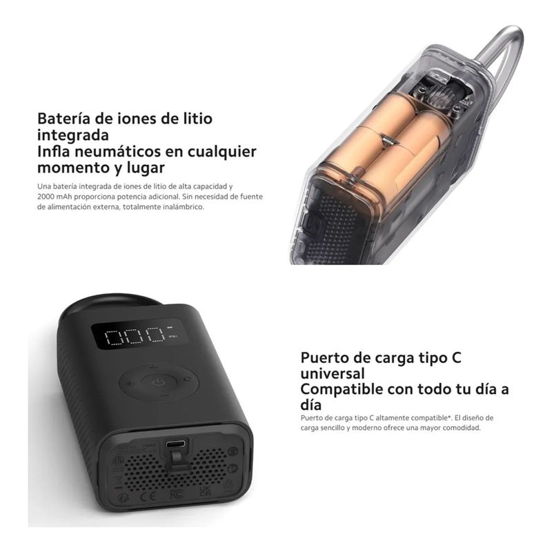 Su batería de 2000 mAh, recargable por USB-C, lo hace totalmente inalámbrico y portátil. Con un peso de solo 490 g, puedes llevarlo en la mochila, el carro o la moto sin ocupar espacio. Incluye adaptador de válvula de conexión rápida, adaptadores adicionales, estuche de transporte y luz LED integrada, perfecta para emergencias nocturnas.
