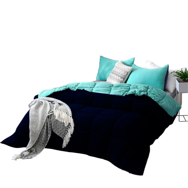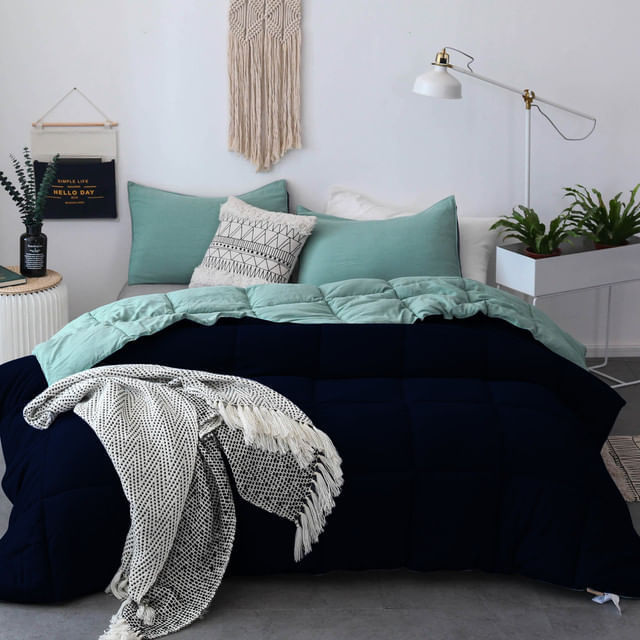 Edredón en Microtex con dos colores. Diseño doble faz en el edredón, fundas y cojines. Edredón con relleno siliconado de 200gr y cojín con relleno siliconado. Figurado en forma de cuadrícula. Debido a su diseño bicolor tienes dos juegos de cama en uno, ya que puedes tenderlo por cualquiera de los dos lados para darle variedad a tu cama. Su material es perfecto para todos los climas. Su diseño es versatil y moderno, se acomoda perfecto a cualquier estilo y tendencia de diseño. Dale a tu hogar la mejor versión con My Home Store. Tamaño sencillo incluye: Edredón, 1 funda y 1 cojín cuadrado. Tamaño Semi doble, Doble, Queen y King incluyen: Edredón, 2 fundas de almohada y 1 cojin cuadrado con relleno.
