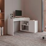 Escritorio en L, con puerta batiente para almacenar libros y otros, compartimentos para objetos decorativos con medidas de: ALTO 71 ANCHO 125 FONDO 90