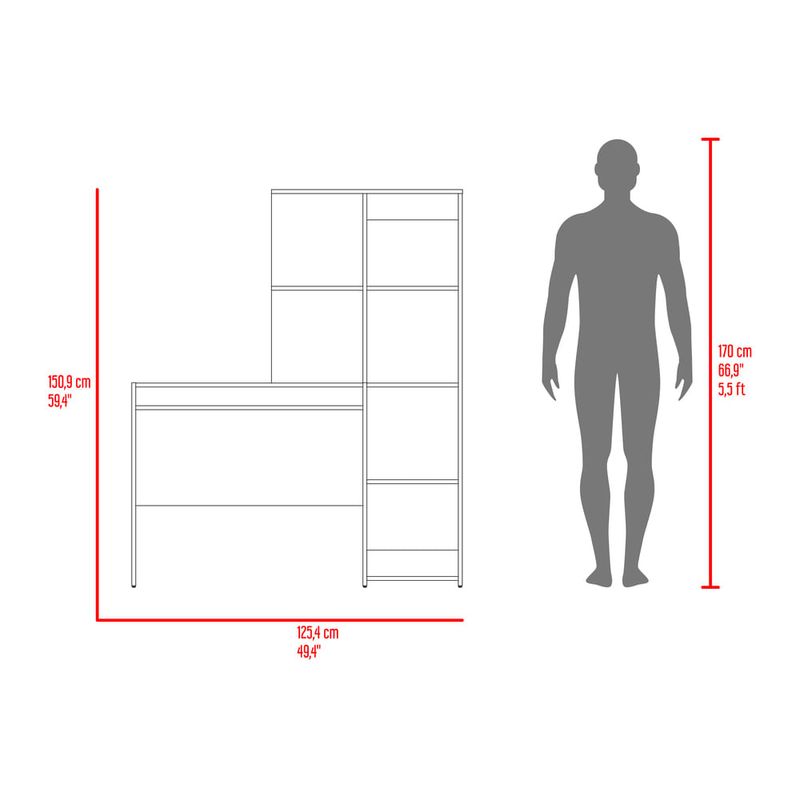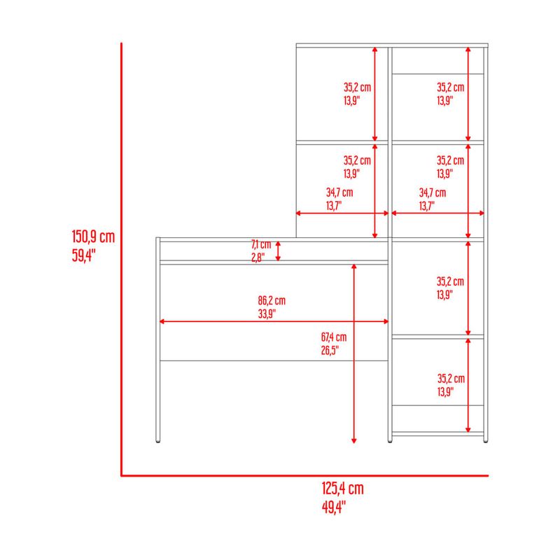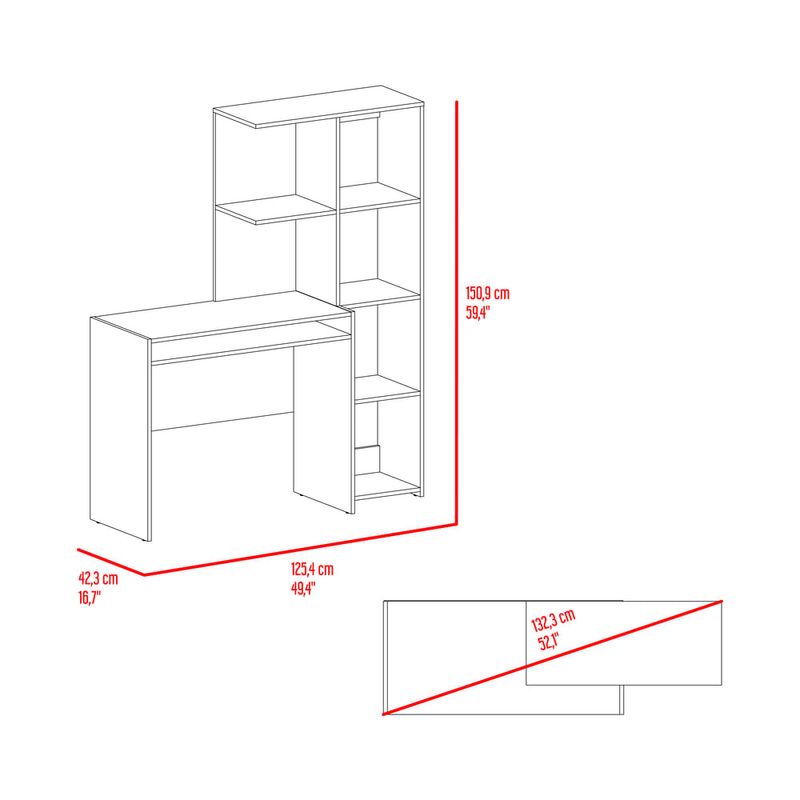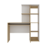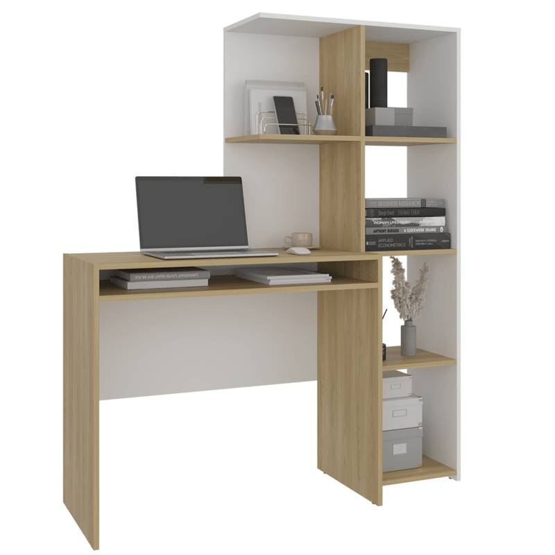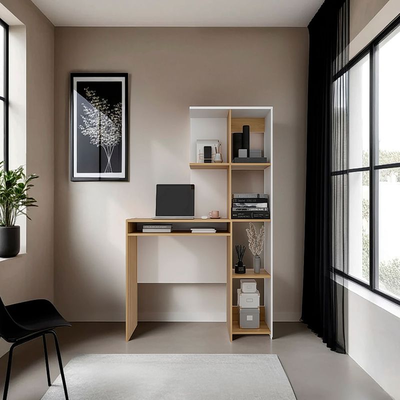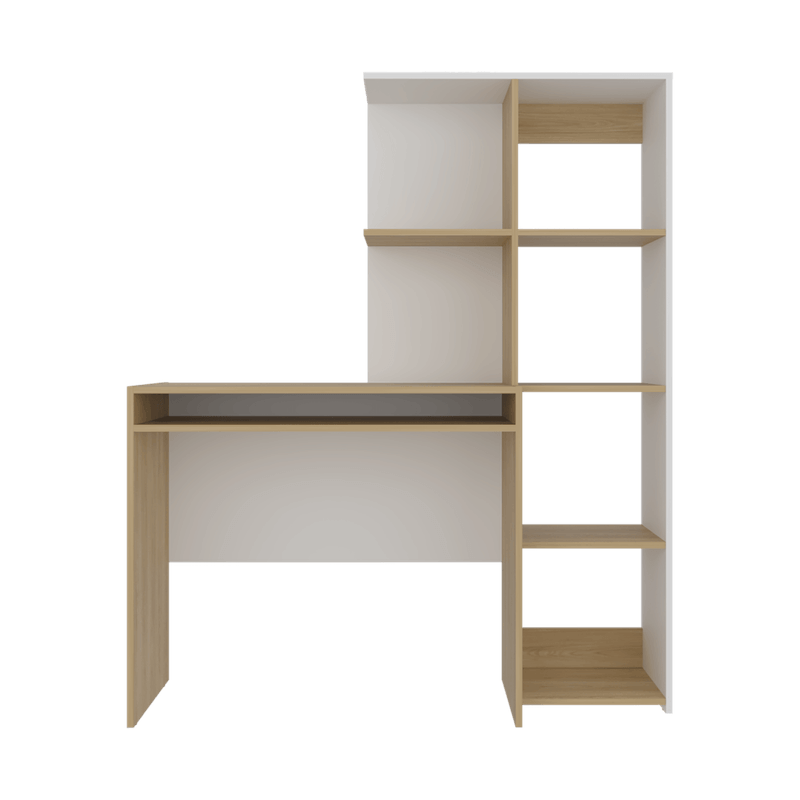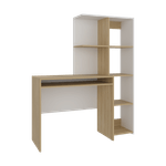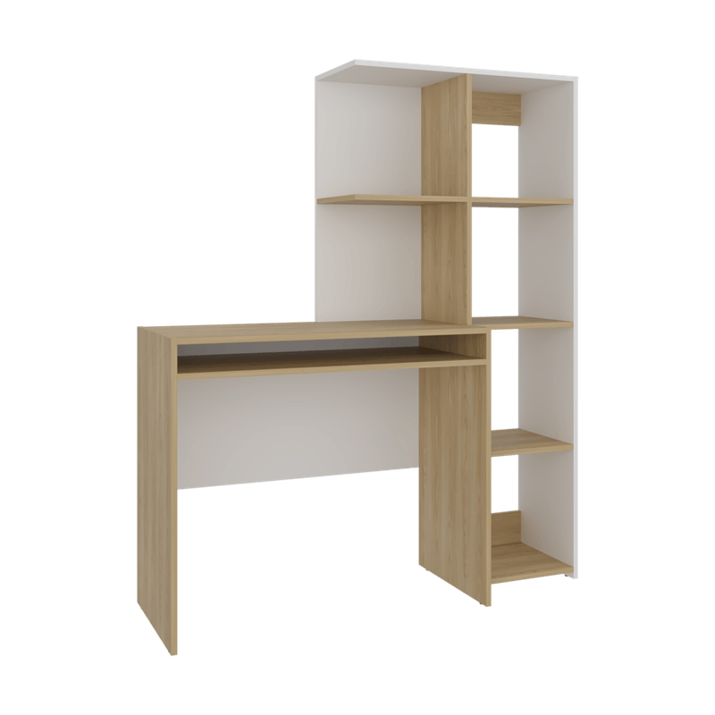 Escritorio con amplia superfiie de trabajo, compartimientos para objetos de estudio o decorativos, multiples entrepaños y superficies para ubicar objetos