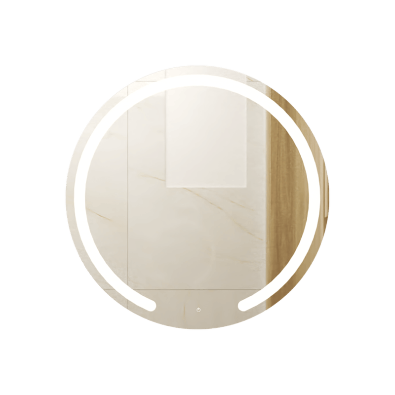 Espejo circular con diseño en sandblasting, con luz led+touch y ensamble a la pared con chaflan