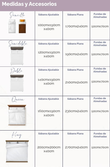 TamañoMedidas (cm)ComplementosSencillo100 x 190