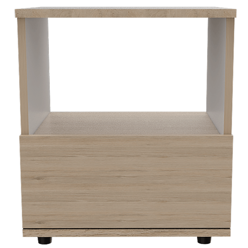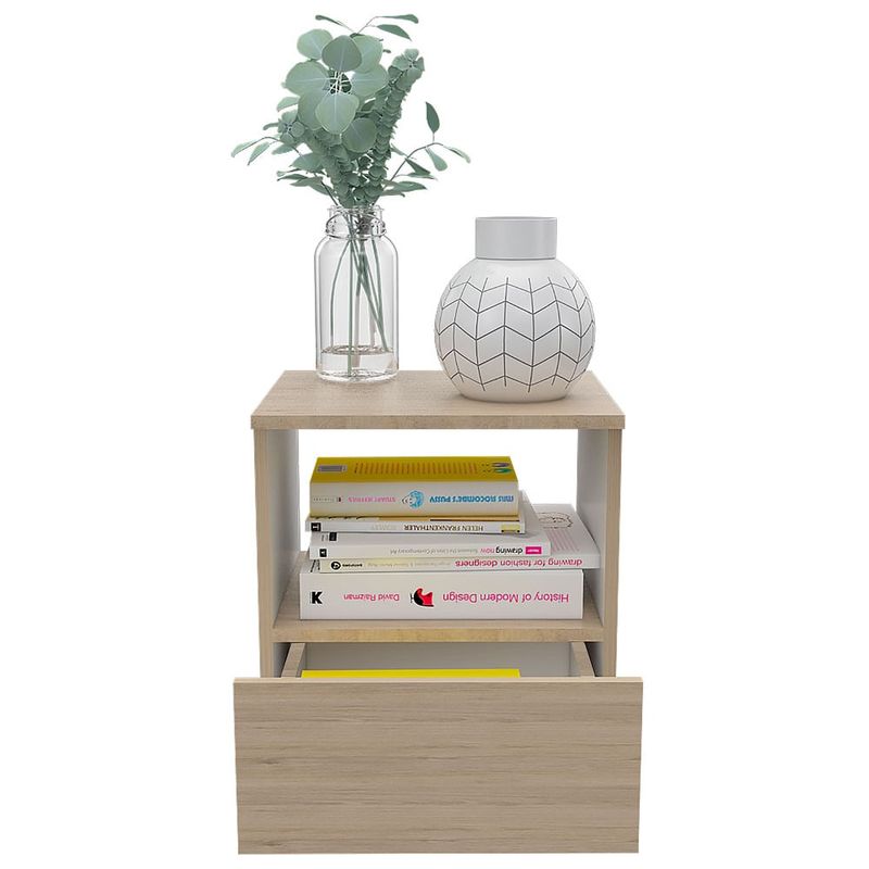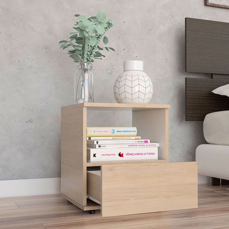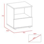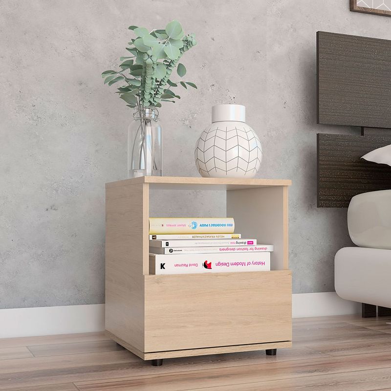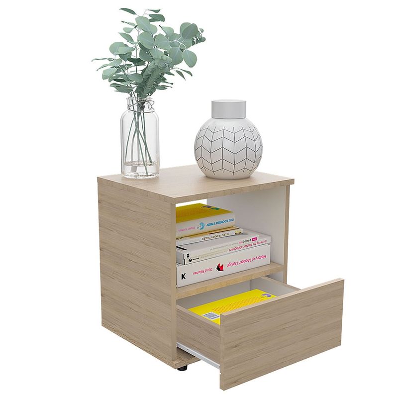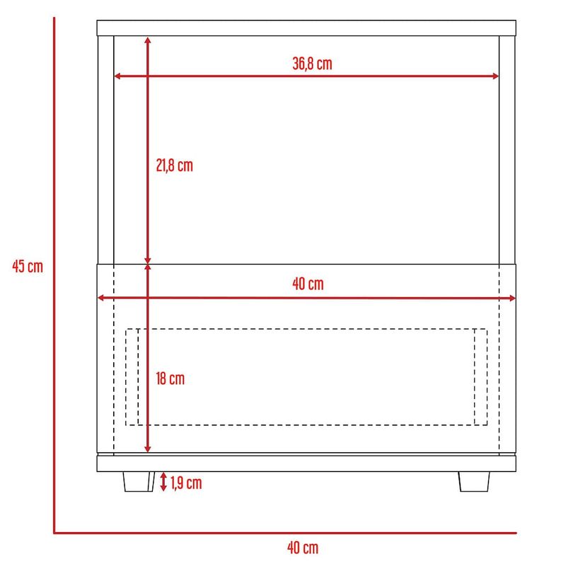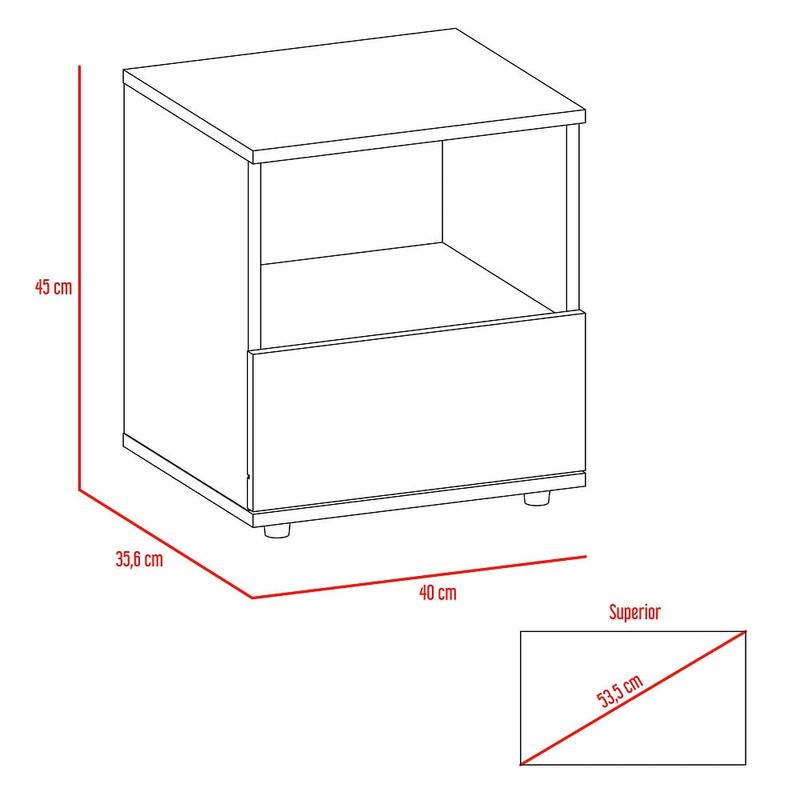 Elegante mesa para dormitorio hecha de madera aglomerada de 15mm. Cuenta con un diseño práctico, espacio para almacenamiento, un cajón inferior deslizable, deslizadores plásticos y facilidad de instalación. Medidas: 45cm alto, 40cm ancho, 35,6cm fondo y un peso de 9,4kg NO INCLUYE ARMADO, Hecho de madera aglomerada, limpiar en seco, no productos abrasivos, ni humedad alta , La foto de este producto ha sido ambientada, por lo cual no incluye ningún adorno, ni accesorios, ni piezas adicionales ni ningún otro elemento que lo acompañan. El color presentado en la fotografía es una aproximación al color real.