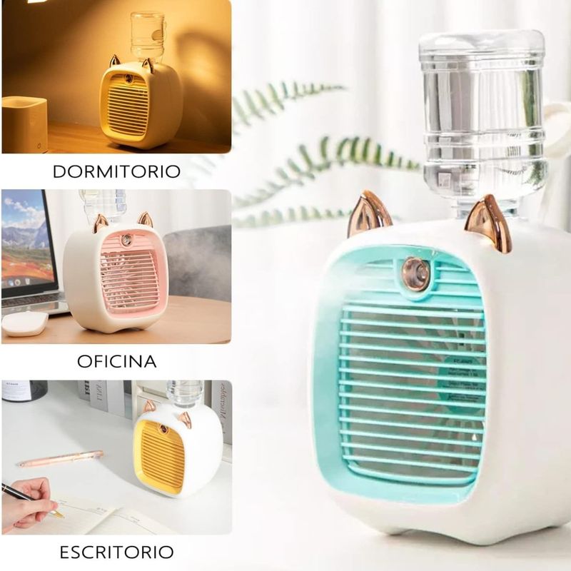 Disfruta de un ambiente fresco y agradable en cualquier espacio con este mini ventilador portátil con humidificador. Su diseño compacto decorativo lo hace ideal para dormitorio, oficina o escritorio. Además de ventilar, cuenta con depósito de agua que ayuda a humidificar el aire, brindando mayor comodidad y frescura, especialmente en climas secos o cálidos. Funciona de manera silenciosa, práctica y portátil, convirtiéndose en la opción perfecta para acompañarte en tus momentos de descanso, trabajo o estudio.
