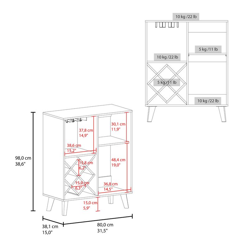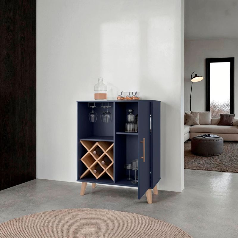Diseño moderno, con espacio para almacenar botellas y objetos de bar, 1 puertas abatibles, patas en madera y es de facil instalación con medidas de: ALTO 98 ANCHO 80 FONDO 38,1