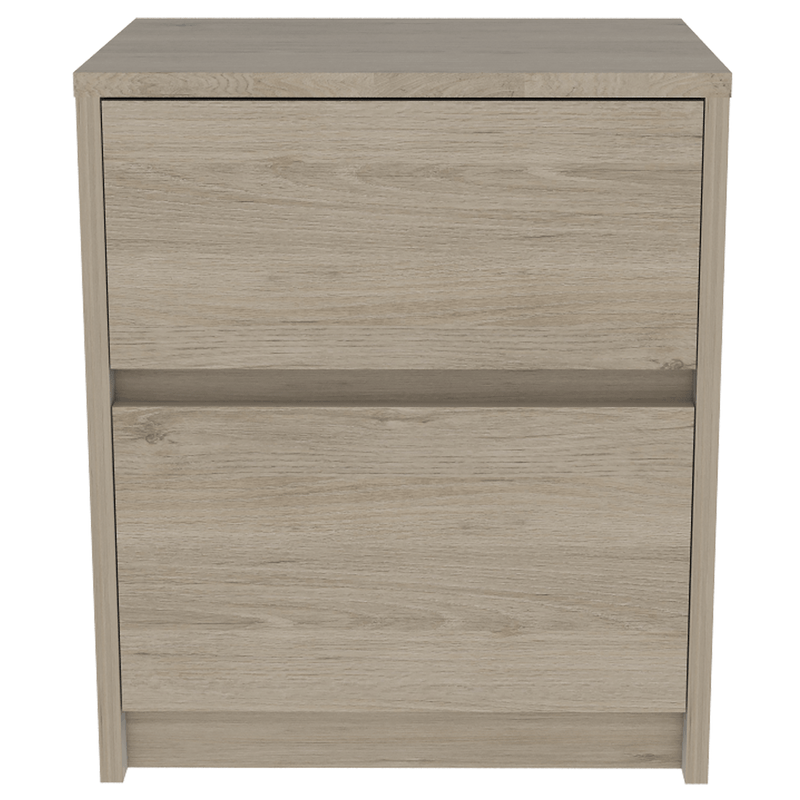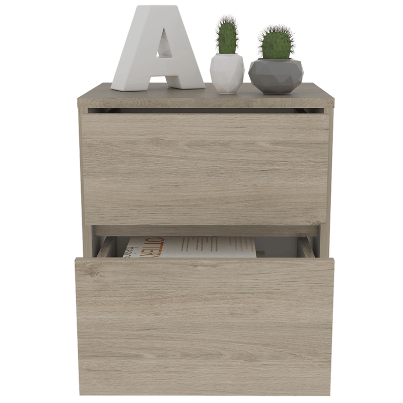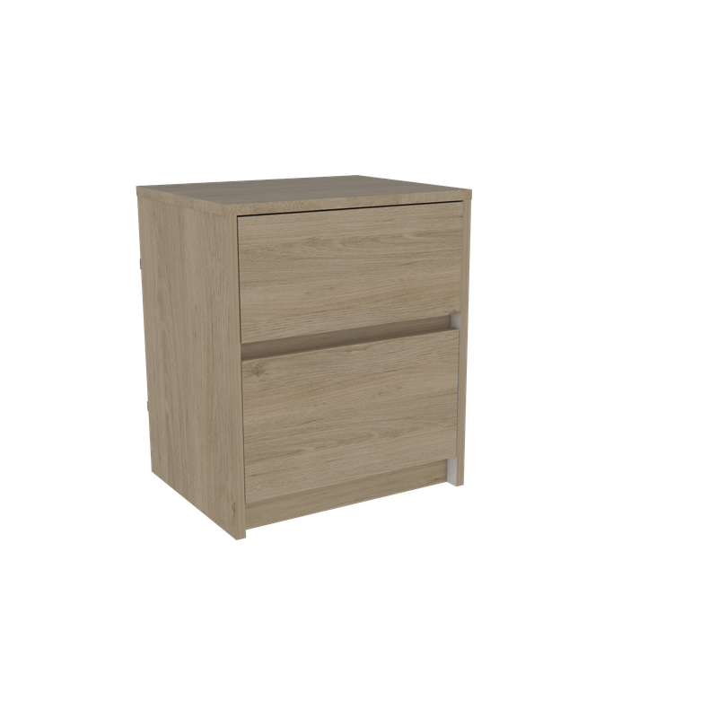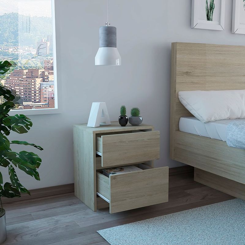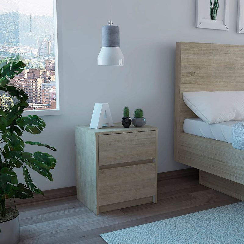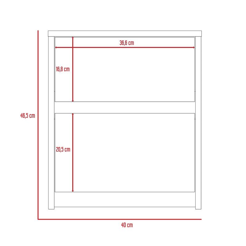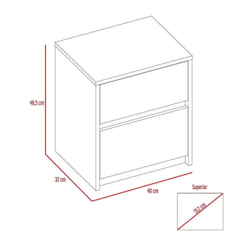 Nochero para dormitorio hecho de madera aglomerada de 15mm. Cuenta con espacio interior para almacenar objetos, dos cajones deslizables con apertura sin manijas y una mesa de noche práctica y funcional. Medidas: 47,2cm alto, 40cm ancho, 32,3cm fondo y un peso de 9,08 kg NO INCLUYE ARMADO, Hecho de madera aglomerada, limpiar en seco, no productos abrasivos, ni humedad alta , La foto de este producto ha sido ambientada, por lo cual no incluye ningún adorno, ni accesorios, ni piezas adicionales ni ningún otro elemento que lo acompañan. El color presentado en la fotografía es una aproximación al color real.
