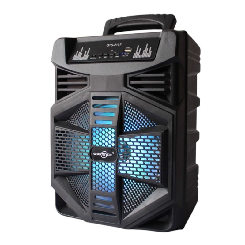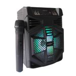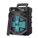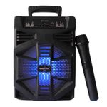 Lleva el entretenimiento a otro nivel con este potente parlante portátil con conexión Bluetooth y luces LED integradas. Ideal para fiestas, reuniones o karaoke, ofrece un sonido claro y envolvente que ambienta cualquier espacio. Incluye micrófono inalámbrico para cantar, animar o hacer presentaciones sin cables ni complicaciones. Su diseño compacto con asa superior facilita el transporte, y su batería recargable.
