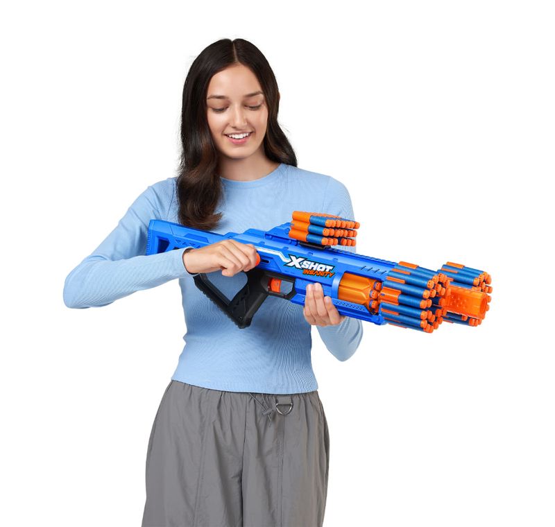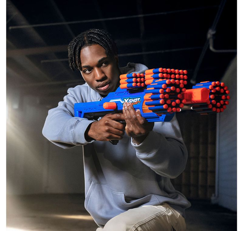 El Berzerko no solo destaca por su potencia y capacidad de almacenamiento, sino también por la tecnología avanzada de sus dardos. Incluye 24 dardos con Tecnología de Bolsillo de Aire, diseñados para ofrecer un disparo más rápido, lejano y preciso, aumentando significativamente tu efectividad en la batalla. Lo más impresionante es la capacidad de personalización del lanzador: puedes combinar el Berzerko con otros lanzadores de la serie XSHOT Insanity para crear configuraciones únicas y poderosas, haciendo que cada batalla sea una experiencia épica y memorable.
