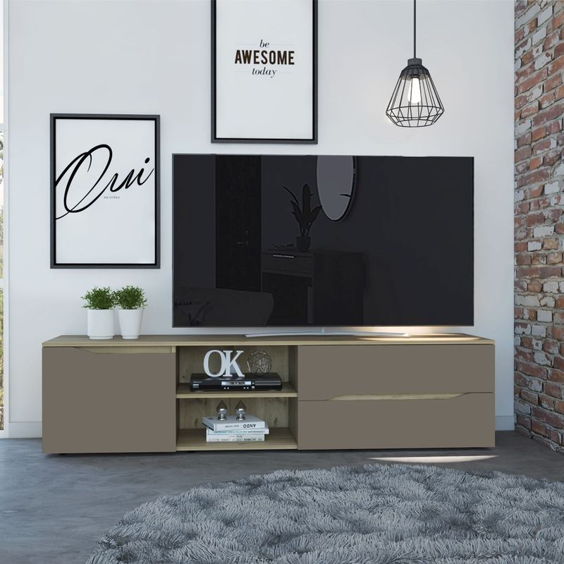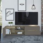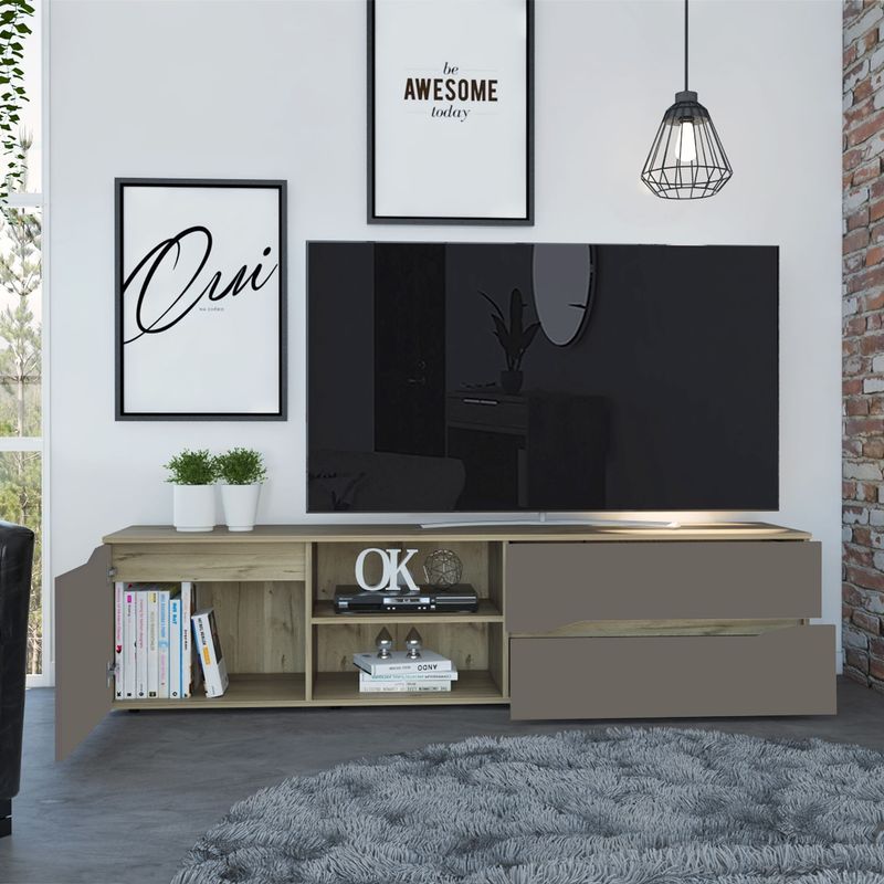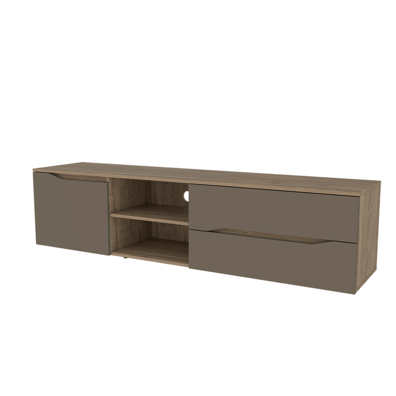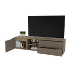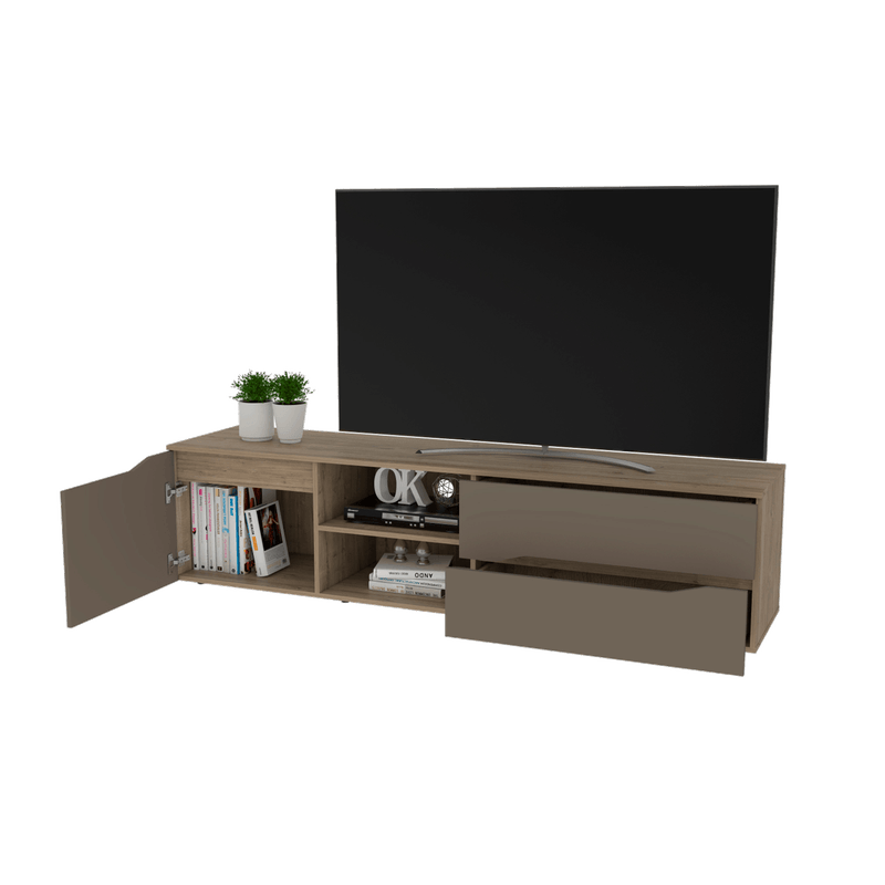 Rack espacio para TV hasta 60'' maximo, puerta abatible, dos cajones, espacios inferiores para colocar objetos decorativos y equipos de audio y video con medidas de: ALTO 45 ANCHO 180 FONDO 42