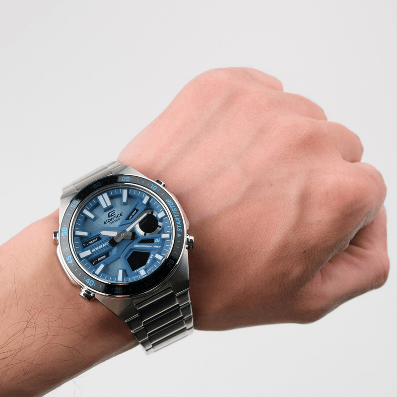 Casio Edifice EFV-C110D-2B combina funcionalidad avanzada con un diseño deportivo y sofisticado. Su carátula azul metálica con detalles en blanco y gris, junto con su estructura en
