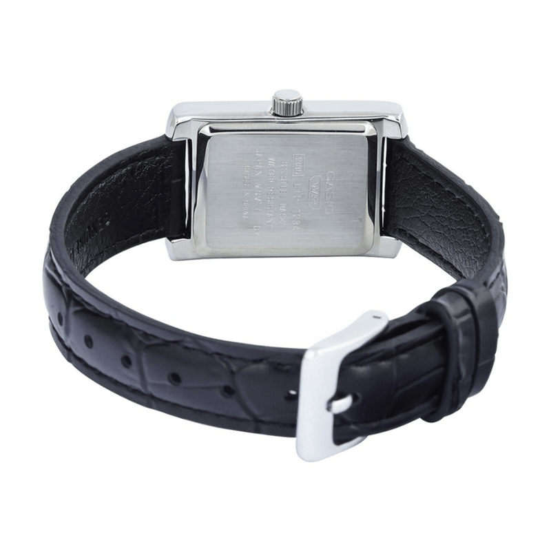 Casio LTP-1234LL-7A combina elegancia clásica y minimalismo en un diseño refinado. Su caja rectangular en tono plateado y su correa de cuero negro con textura tipo cocodrilo reflejan sofisticación, ideal para mujeres que buscan un reloj versátil, cómodo y con estilo atemporal.