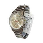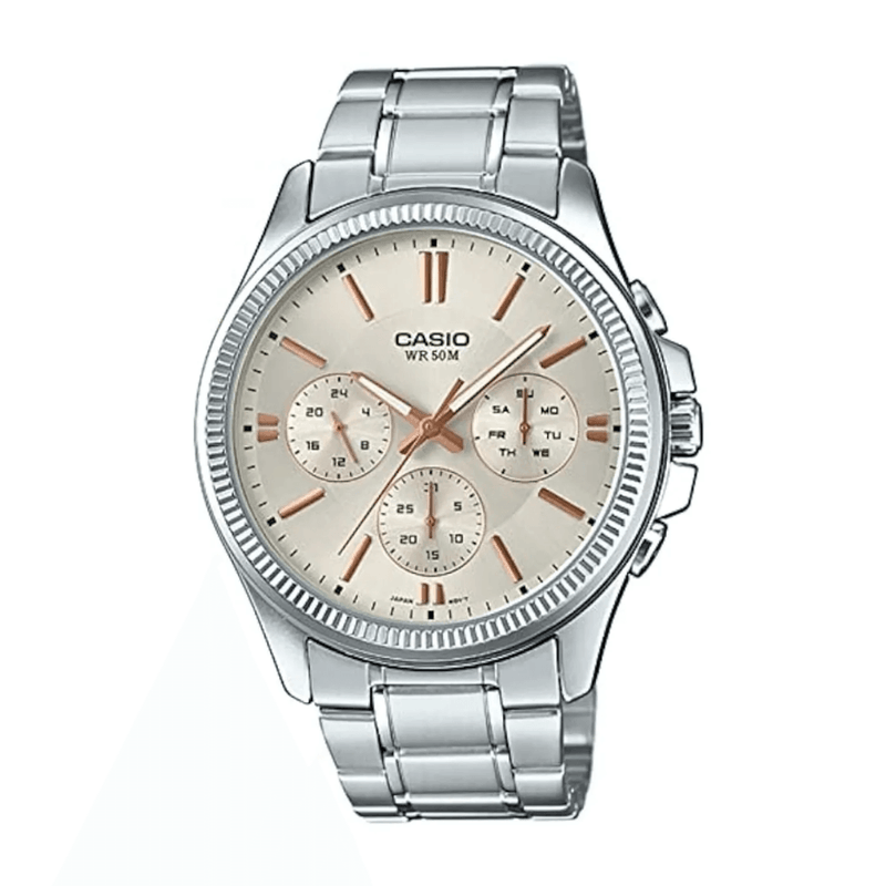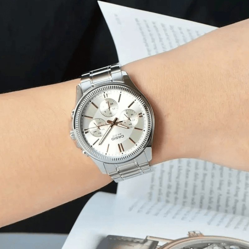 Este reloj Casio para caballero se destaca por su diseño clásico y funcional. Cuenta con tres subesferas que indican día, fecha y hora en formato 24 h. Su estructura de acero inoxidable y su carátula en tonos plateados con acentos azules ofrecen un estilo sobrio y versátil, ideal para toda ocasión.