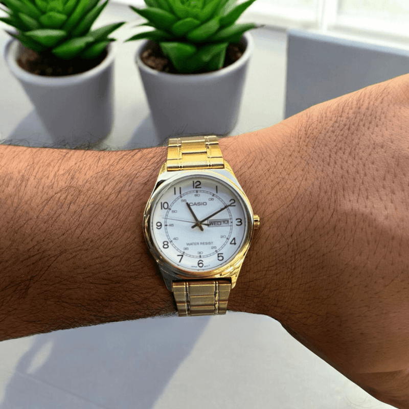 Un reloj clásico y sofisticado que combina la durabilidad del acero inoxidable con un acabado dorado que realza su elegancia. Su esfera blanca con números arábigos en negro ofrece un diseño claro y atemporal, mientras que la correa metálica proporciona comodidad y resistencia. Perfecto para quienes buscan un accesorio refinado para ocasiones formales y de uso diario.