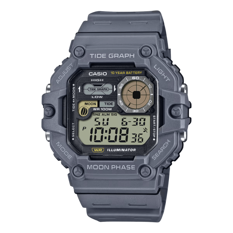 Un reloj digital de alto rendimiento, diseñado para quienes buscan resistencia y funcionalidad avanzada. Con gráficos de mareas, fases lunares y resistencia al agua de 100 metros, este modelo es ideal para actividades al aire libre, deportes acuáticos y aventuras extremas. Su diseño robusto en resina gris asegura durabilidad y comodidad en cualquier situación.