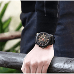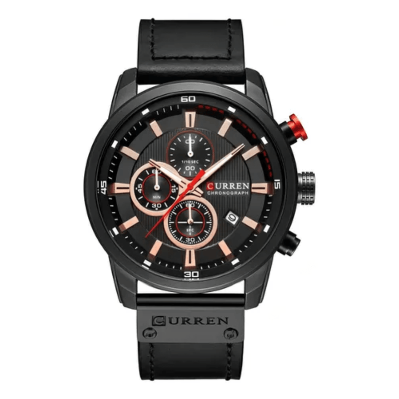 Reloj Curren 8291 destaca por su diseño deportivo y elegante, con caja metálica en acabado negro mate y correa en cuero negro. Su tablero oscuro con detalles en rojo y dorado rosado aporta un contraste llamativo, mientras que su funcionalidad de cronógrafo lo convierte en un accesorio versátil y preciso para cualquier ocasión.