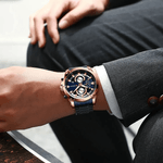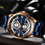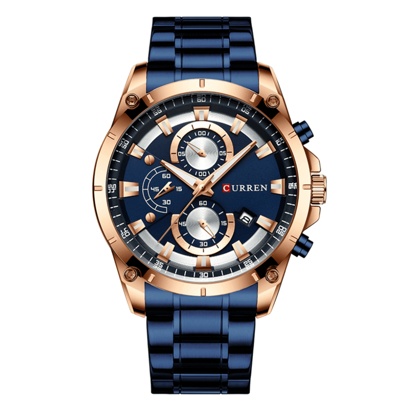 Curren 8360 en acero azul con caja en tono dorado rosado es el accesorio perfecto para quienes buscan destacar con estilo. Su esfera azul con subesferas cronógrafo y calendario integrado hacen de este reloj una pieza versátil, ideal tanto para ocasiones formales como para el uso diario.