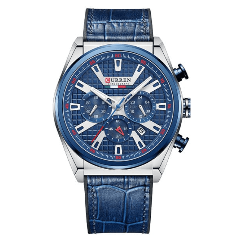 Reloj Curren 8392 combina elegancia y deportividad en un diseño sofisticado con caja metálica y correa en cuero azul de textura estilo cocodrilo. Su tablero en azul con subesferas de cronógrafo aporta un toque distintivo y moderno, ideal para hombres que buscan un reloj versátil y atractivo para cualquier ocasión.