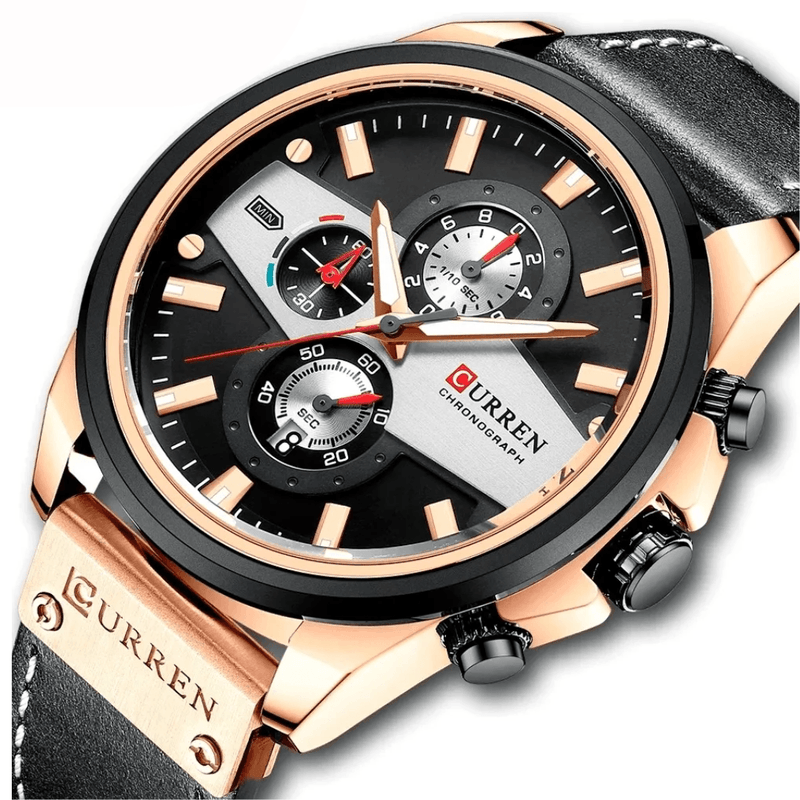 Un diseño moderno y elegante que combina el estilo clásico del cuero con la robustez de una caja metálica en tonos oro rosa y negro. Su cronógrafo funcional lo convierte en un reloj versátil, ideal para el hombre que busca sofisticación y practicidad en cada detalle.