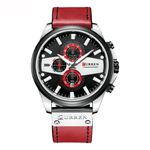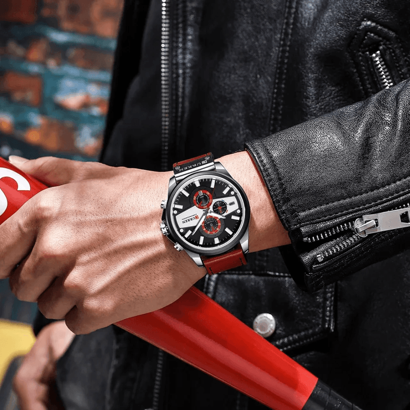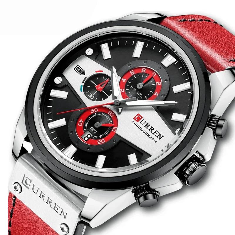 Un reloj de carácter audaz y deportivo que combina la fuerza del negro con detalles en rojo vibrante. Su correa en cuero genuino le da un aire moderno y elegante, mientras que su cronógrafo funcional lo convierte en el accesorio perfecto para quienes buscan estilo y precisión.
