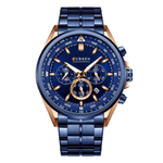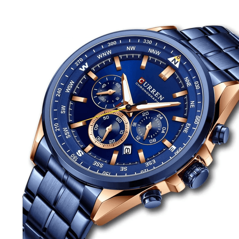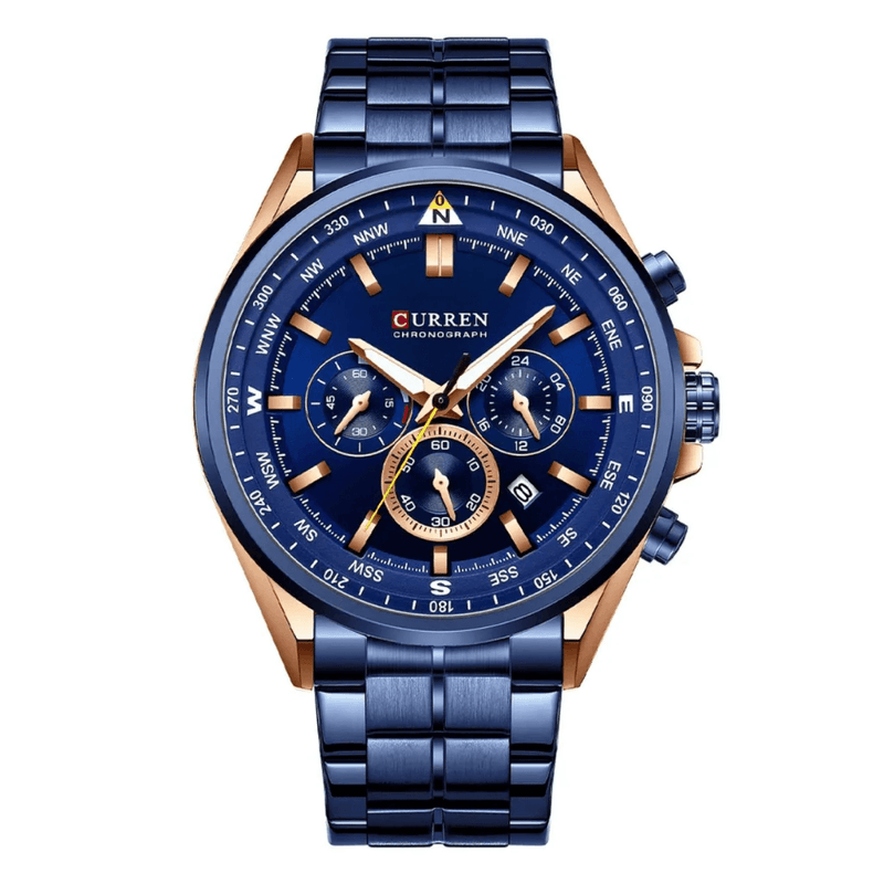 Curren 8399 combina un brazalete en acero azul metálico con caja en tono dorado rosado y una esfera azul multifuncional que resalta a primera vista. Su cronógrafo y calendario lo hacen un accesorio práctico, mientras que su estilo sofisticado lo convierte en una pieza ideal para cualquier ocasión.