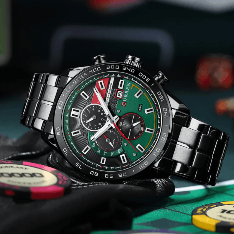 dial multicolor en verde, negro y detalles rojos, ofreciendo un look llamativo y sofisticado.