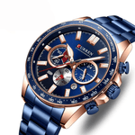 Un diseño llamativo que combina la fuerza del acero inoxidable con el estilo moderno del color azul metálico y detalles en dorado rosa. Su carátula azul con subesferas funcionales y taquímetro en el bisel lo convierten en un reloj deportivo con un toque de elegancia, ideal para destacar en cualquier ocasión.