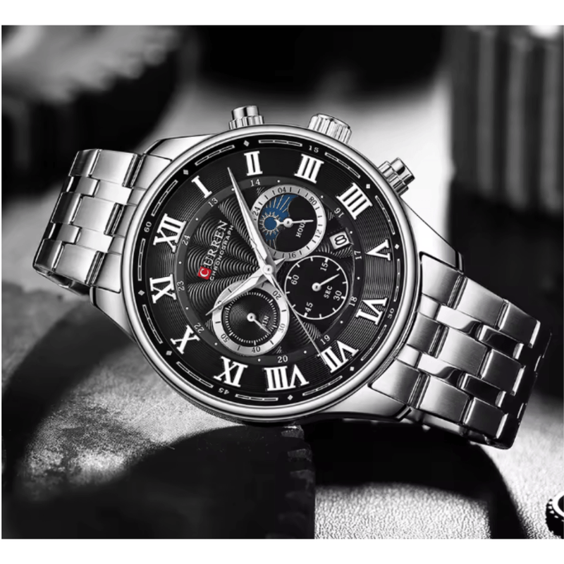 Un diseño sofisticado y elegante que combina el estilo clásico con la funcionalidad moderna. Su caja y correa en acero plateado realzan el tablero negro con números romanos en tono blanco, ofreciendo una apariencia distinguida y de gran presencia en la muñeca.