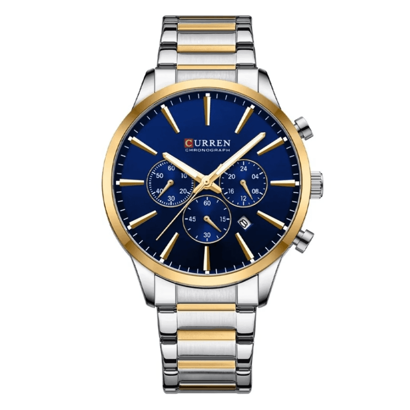 Un diseño moderno y sofisticado que combina la elegancia del acero inoxidable con un tablero azul intenso y detalles dorados. Ideal para quienes buscan un accesorio con presencia, versatilidad y estilo, perfecto tanto para ocasiones formales como para el día a día.