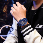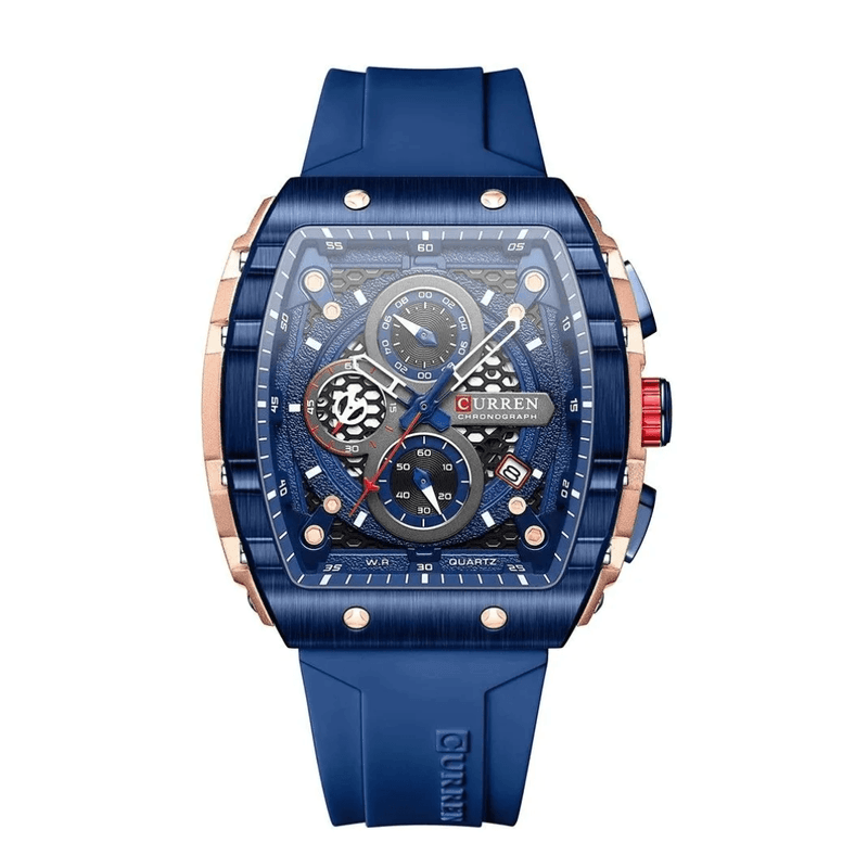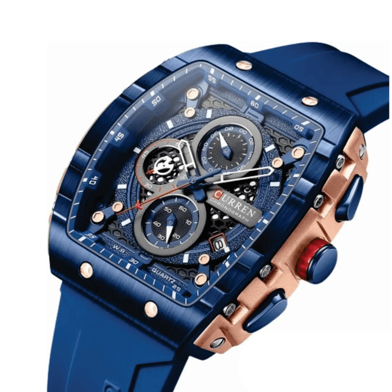 El Reloj Curren 8443 ofrece un diseño innovador y sofisticado, con caja rectangular en acabado azul y detalles dorados que le aportan un estilo exclusivo. Su tablero esqueleto en azul con acentos en rojo y blanco resalta por su modernidad, mientras que la correa en resina azul garantiza resistencia y comodidad. Es la elección ideal para hombres que buscan un accesorio llamativo y con carácter deportivo.