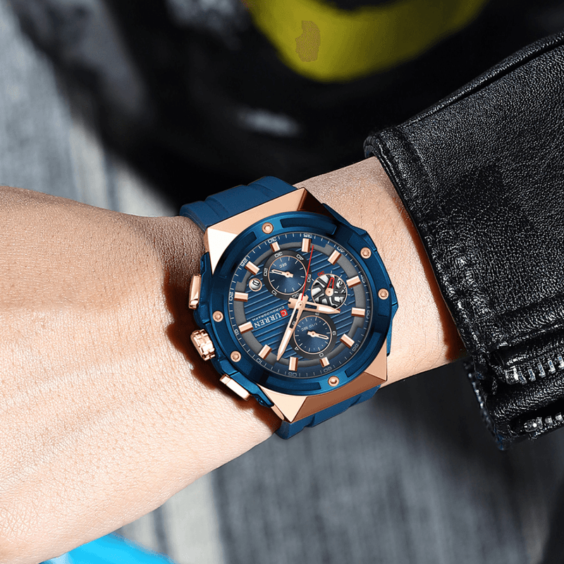 Reloj Curren 8462 ofrece un diseño deportivo y moderno, con correa en resina resistente y tablero azul con detalles de cronógrafo. Una pieza llamativa que combina funcionalidad y estilo, ideal para acompañar tu look diario con un toque masculino y dinámico.