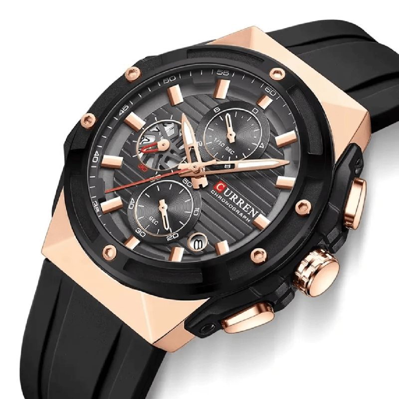 Reloj Curren 8462 se distingue por su estilo deportivo y sofisticado, con correa en resina de alta resistencia y un tablero en color negro que resalta sus detalles de cronógrafo. Es el accesorio perfecto para hombres que buscan un reloj moderno, funcional y versátil para el día a día.